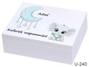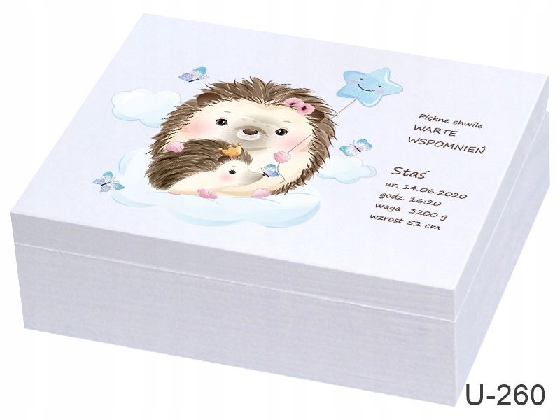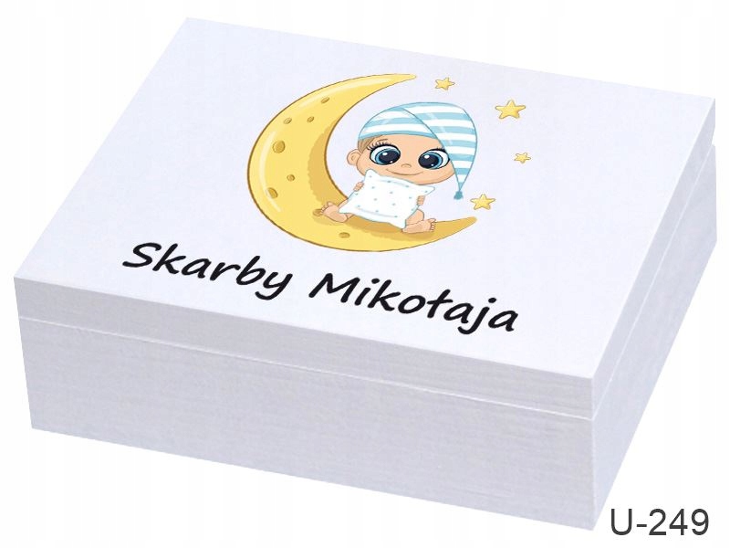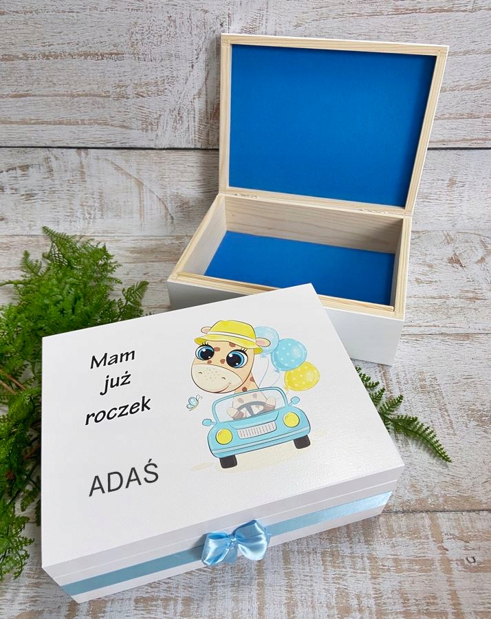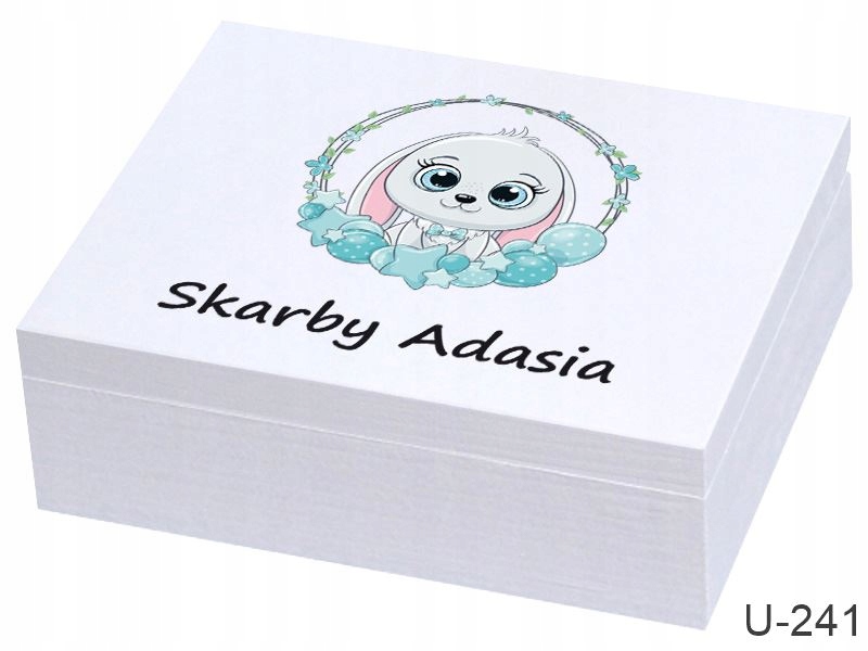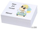 Drewniane pudełko z zewnątrz malowane na biało wieko z kolorowym nadrukiem bezpośrednio na pudełku , personalizacja IMIĘ