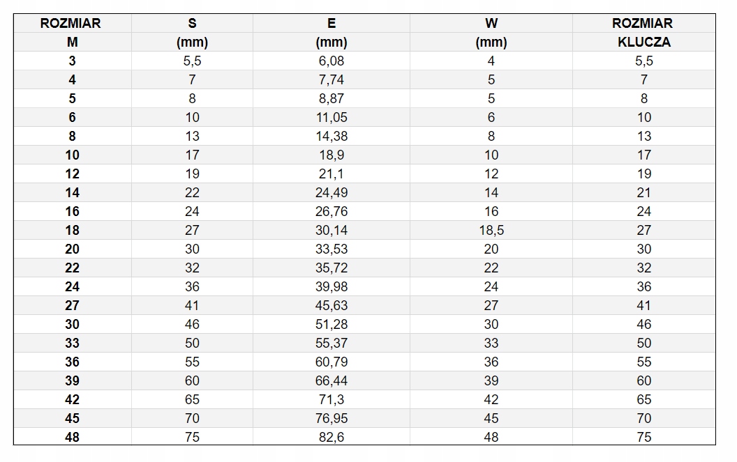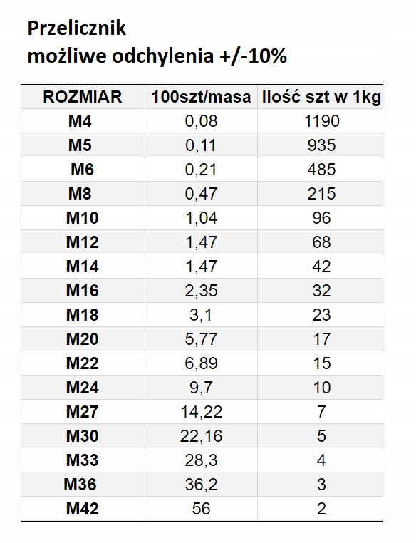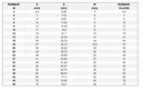 Wymiary oraz przelicznik w/g tabeli