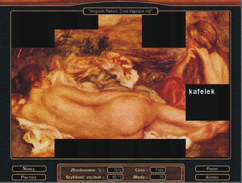 Gra Galeria. Poprawne i szybkie wpisanie pojawiającego się słowa odsłania fragment obrazu. Tu jest to obraz Renoira z zestawu Malarstwo, ale można wybrać inne zestawy, np. zdjęcia pejzaży.