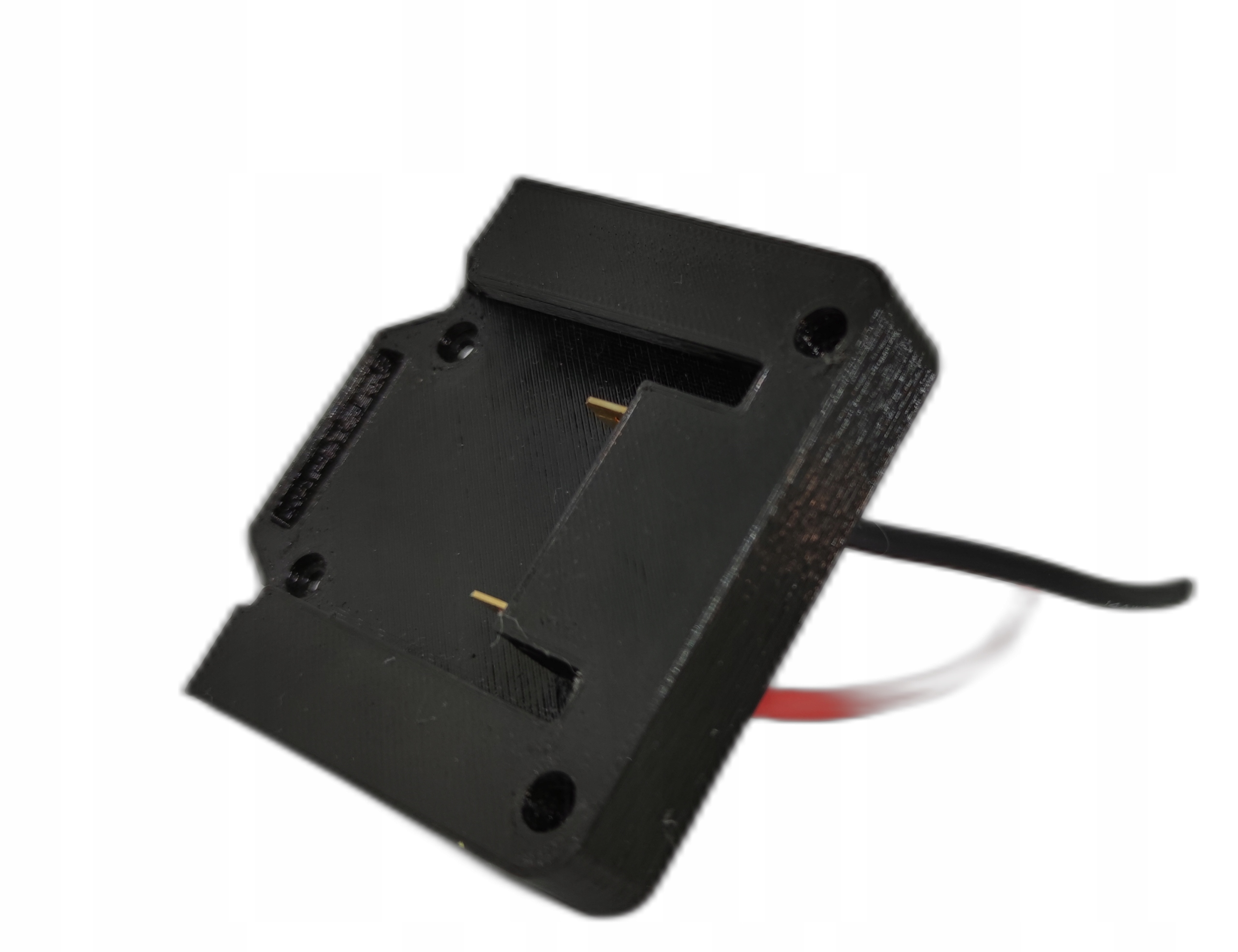Dzięki takiemu adapterowi można z baterii zasilić np. lampę warsztatową lub inne elektronarzędzie. Jest to druk 3D.