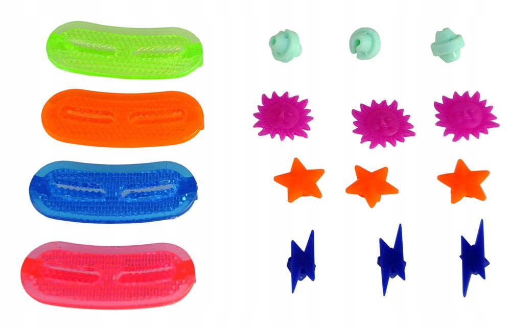 Komplet kolorowych odblasków rowerowych oraz koralików wciskanych na szprychy koła. Zadaniem zestawu jest nie tylko ozdobienie roweru lecz także zwiekszenie jego widoczności, co znacząco wpływa na bezpieczeństwo jazdy