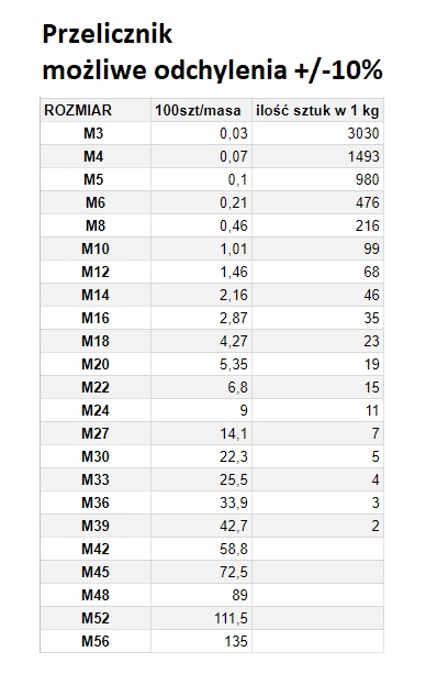 Wymiary oraz przelicznik w/g tabeli