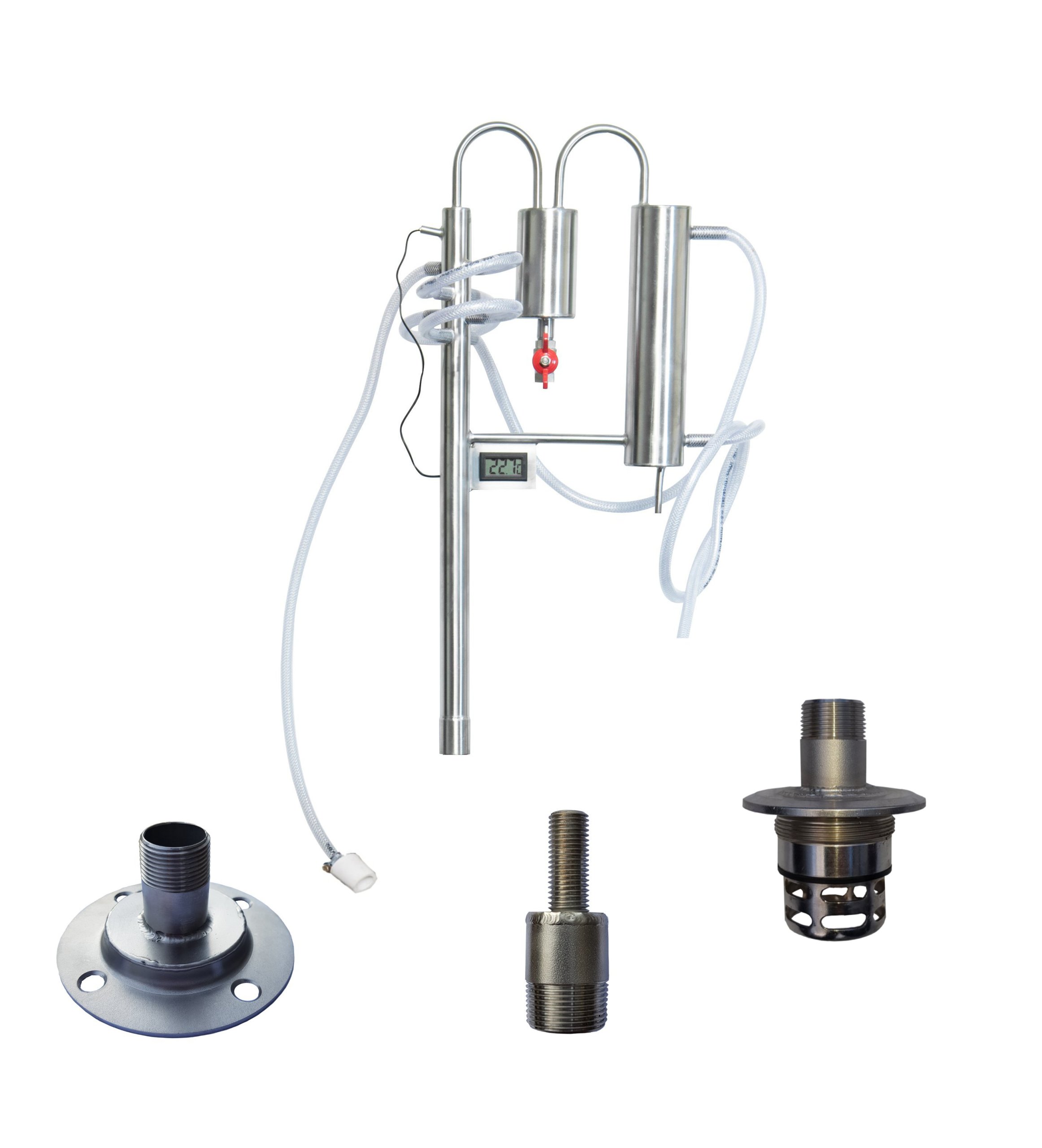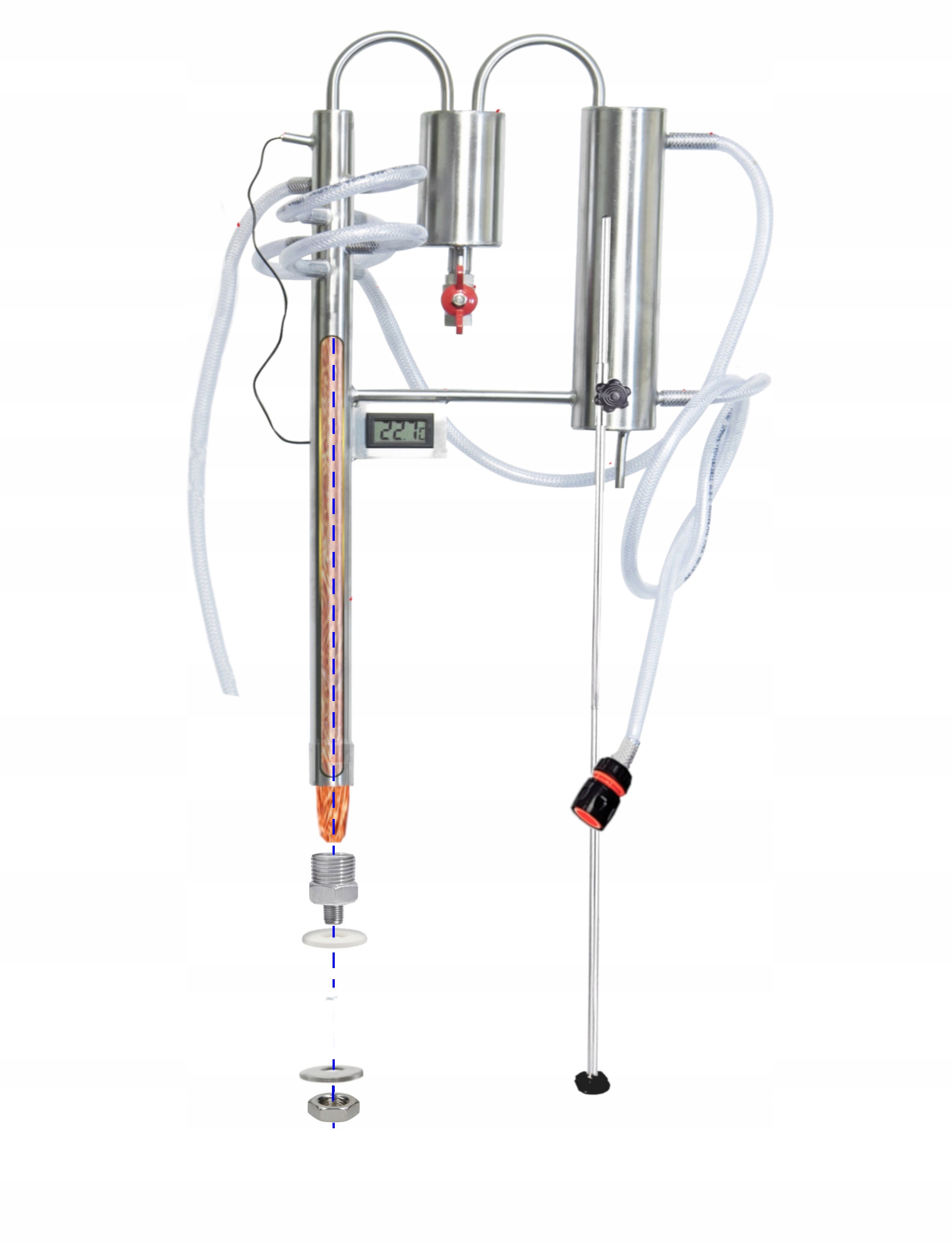 1. Elektroniczny termometr z sondą, którą wkładamy do kapilary na szczycie kolumny. Dzięki zastosowaniu termometru mamy pełna kontrolę nad temperaturą oparów wchodzących do chłodnicy co ułatwia nam regulację mocy % końcowego produktu.