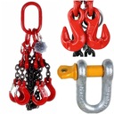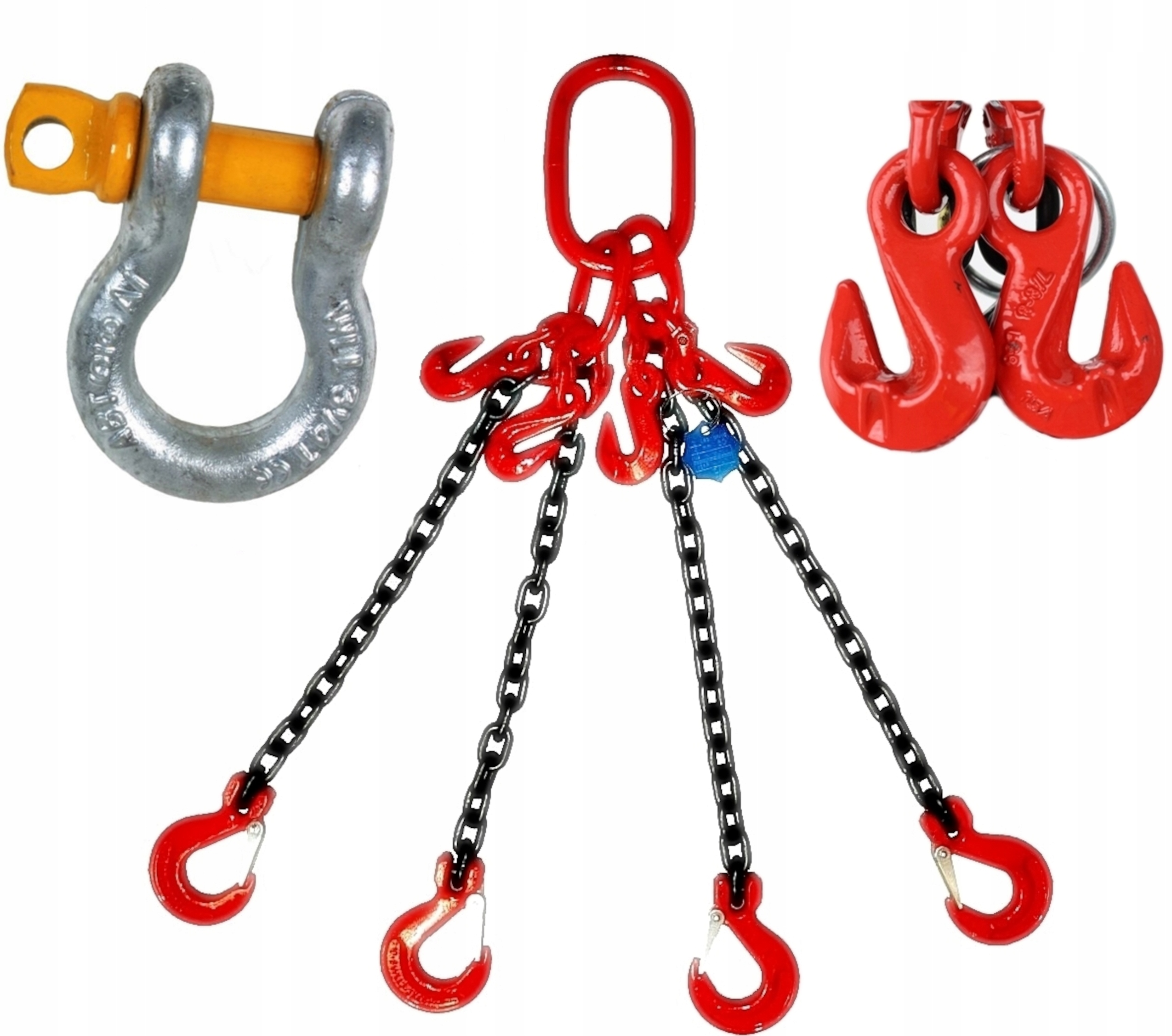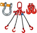 Zawiesie łańcuchowe 4-cięgnowe ogniwem zbiorczym /wym. ogniwa 135 x 75 mm i 54 x 25 mm-małe / wraz z hakami skracającymi oraz hakami z zabezpieczeniem przed wypięciem cięgna z zapadką , do zawiesia dołączona szakla podłużna "U" DOR:3,25 tony.