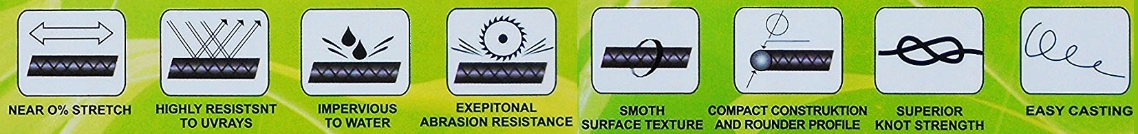 Plecionka wykonana z wysokiej jakości włókien, charakteryzuje się wysoką wytrzymałością na węźle, oraz zerową rozciągliwością. Miękka, odporna na wszelkie uszkodzenia mechaniczne.