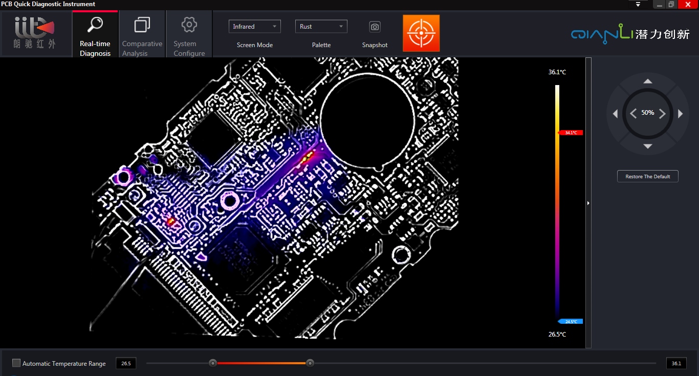 Благодаря мощному программному обеспечению интеллектуального анализа изображения на стороне ПК применения интеллектуальных алгоритмов, камера подает рабочую температуру для любого элемента диска главной живой и указывает на разницу температур в ее областях.