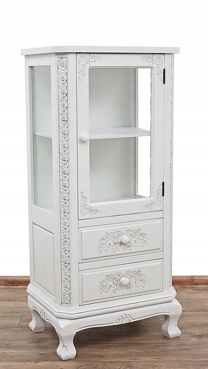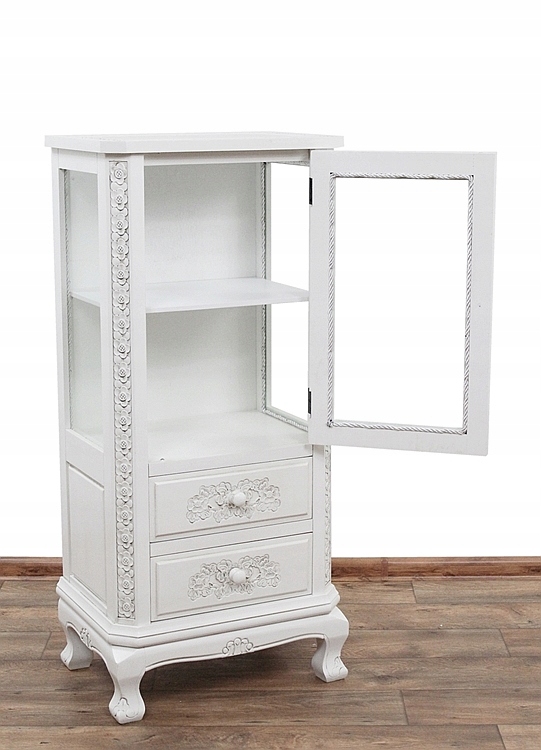 Urokliwy, drewniany mebel z dwiema szufladami. Całość ozdobiona jest przepięknymi rzeźbieniami.