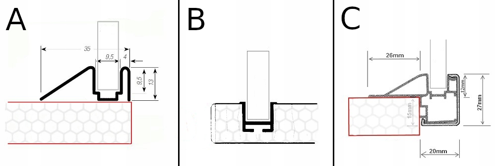 B: фрезерованная направляющая (фрезерование должно быть выполнено в корпусе шкафа)