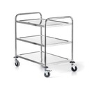 3-полочная тележка для официантов из нержавеющей стали. Полированная нержавеющая сталь типа 201. Полки из листового металла толщиной 0,7 мм. Круглые трубы профилировщиков. включая 2 колеса с тормозами. Надежное и эстетичное исполнение.