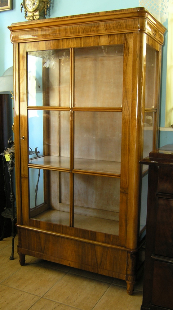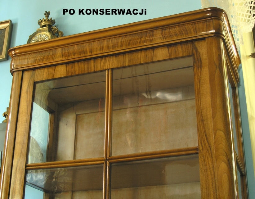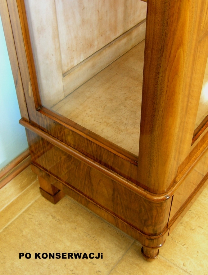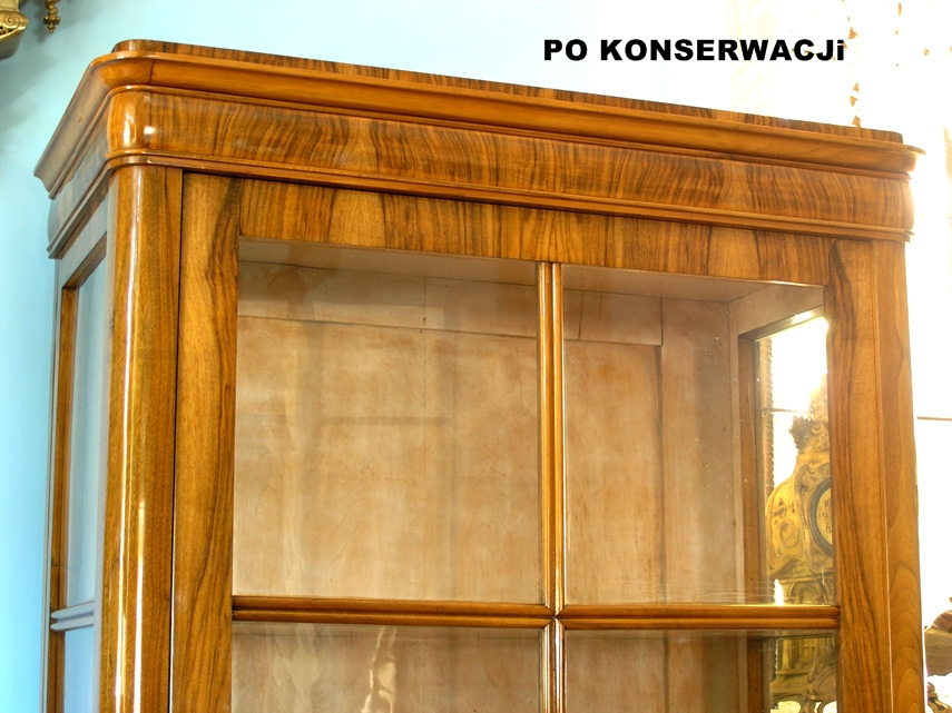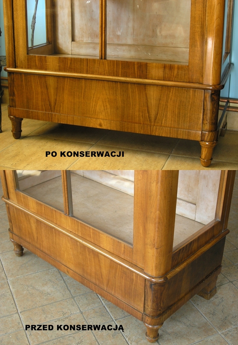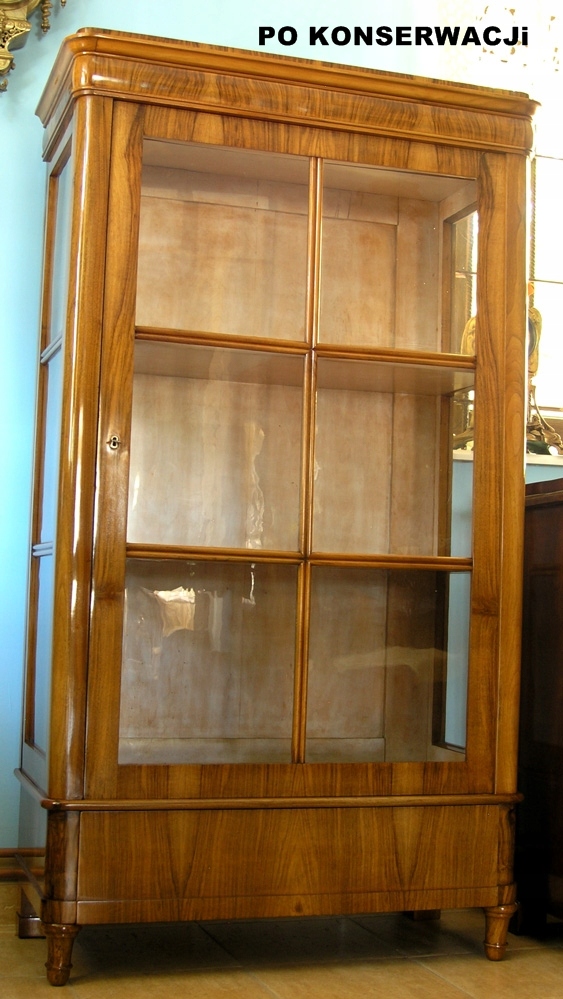 Serwantka Biedermeier - orzech . Po konserwacji - politura . Oryginalne bielenie w środku . Szerokość 86,5 cm ; głębokość 40,5 cm ; wysokość 153,5 cm .