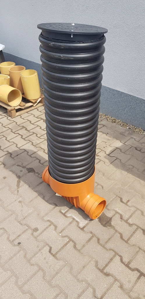 Kompletna studzienka kanalizacyjna z możliwością podłączenia rur fi 160 przy podstawie studni z pokrywą z tworzywa PP mocowaną na wkręty.