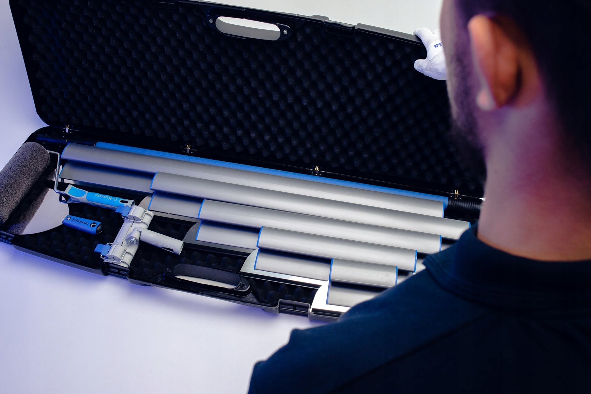 Чемодан наполнен пеной, чтобы всегда самые ценные и точные инструменты не они были повреждены во время транспортировки от строительства к строительству.