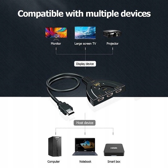 Ten przełącznik HDMI może przesyłać wideo o wysokiej rozdzielczości (4K) i dźwięk cyfrowy z dowolnego portu źródła sygnału do wyświetlacza. Porty źródła sygnału wszystkich urządzeń wejściowych mogą być dopasowane do portów wideo o wysokiej rozdzielczości w tym samym czasie i są kompatybilne z HD-DVD, SKY-STB, PS3, Xbox6 itp. Port wyjściowy przełącznika może przesyłać wysokiej rozdzielczości sygnały audio / wideo do wyświetlacza o wysokiej rozdzielczości.