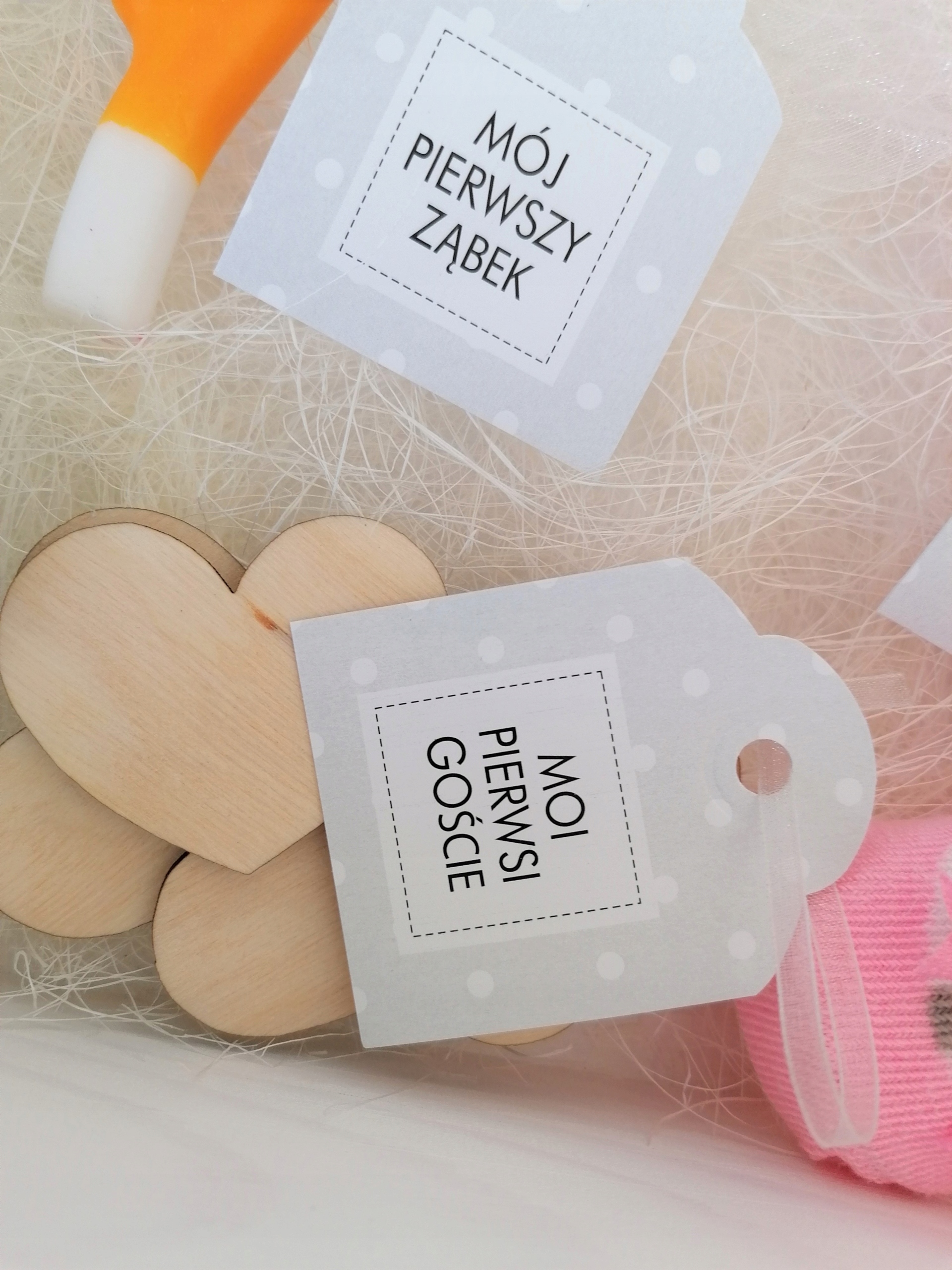 Do karteczki „moi pierwsi goście” - GRATIS dołączone zostały 4 drewniane serduszka na podpisy pierwszych gości.