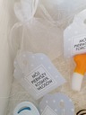 Dodatkowo w środku znajdują się 2 tiulowe, białe woreczki na pierwszy ząbek i pierwszy kosmyk włosów.