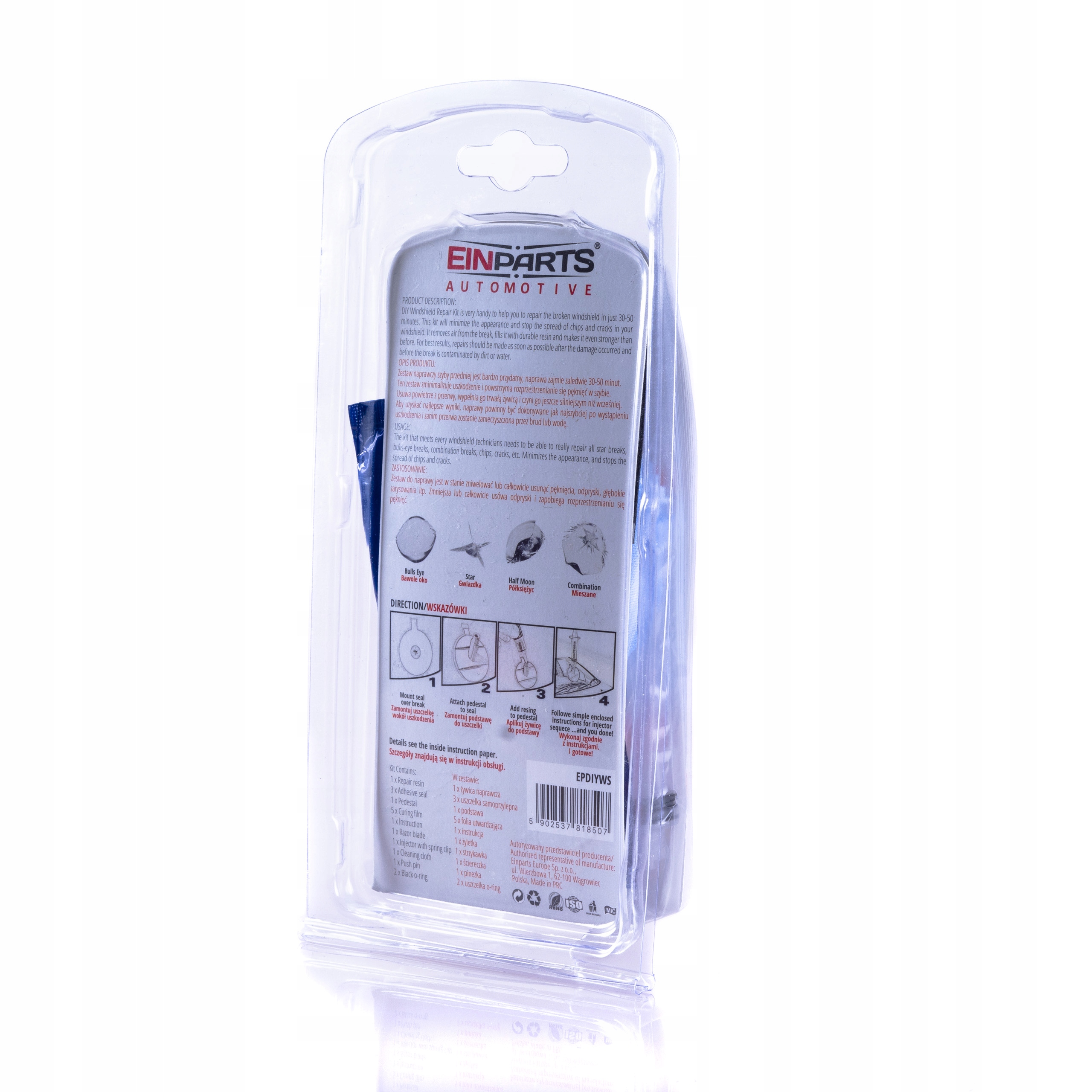 Zestaw do samodzielnej naprawy / renowacji szyb marki EinParts Automotive EPDIYWS umożliwia usunięcie odprysków, głębokich zarysowań jak i również pęknięć.