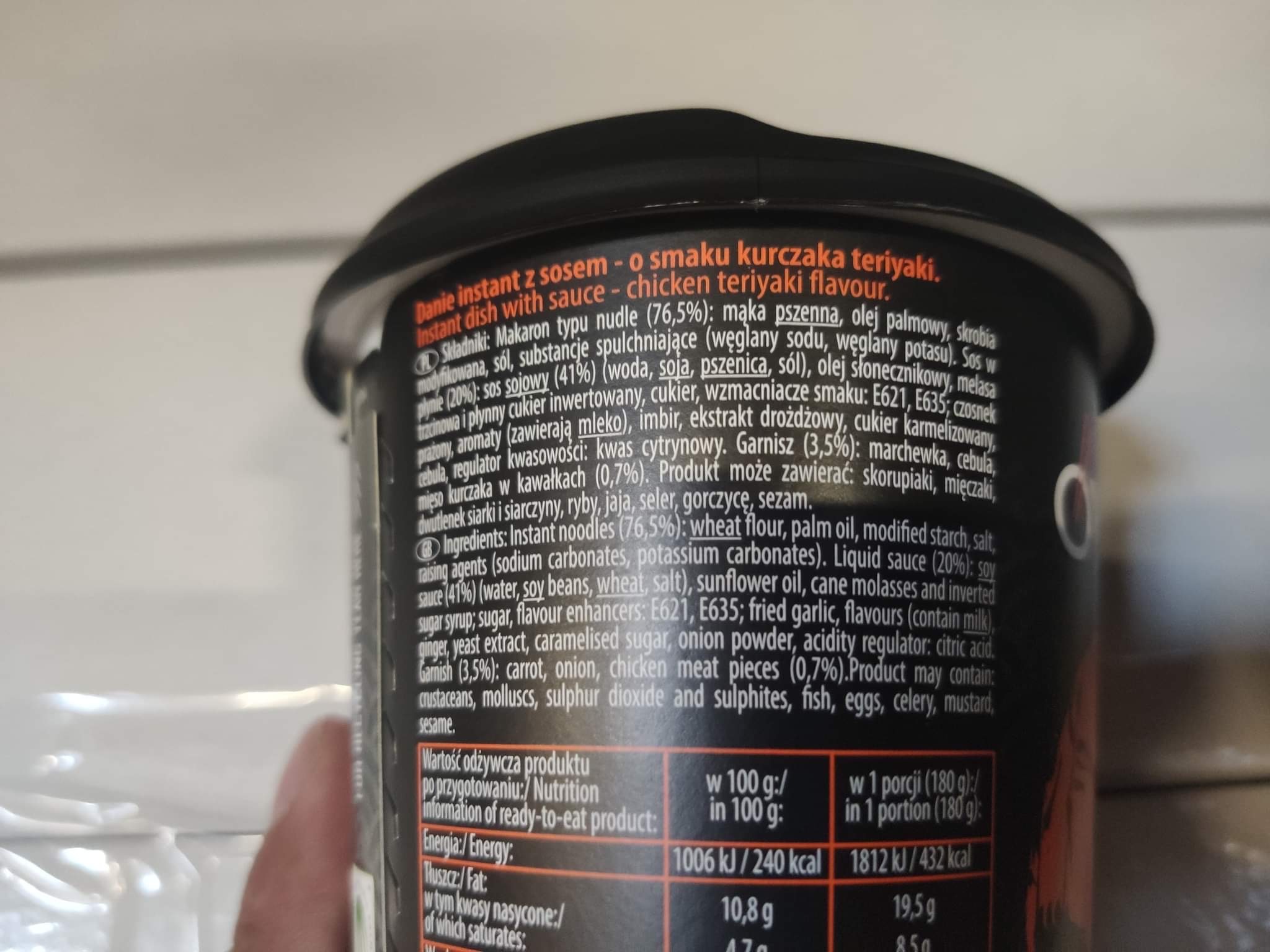 Makaron typu nudle (76,5%): mąka pszenna, olej palmowy, skrobia modyfikowana, sól, substancje spulchniające (węglany sodu, węglany potasu)