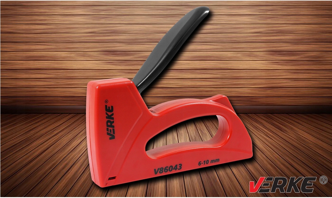 Zszywacz tapicerski marki VERKE. Przeznaczony do szybkiego łączenia różnych materiałów np. drewna z tkaninami, kartonem, papierem lub skórą. Wykorzystywany w pracach tapicerskich, dekarskich, dekoratorskich, wykończeniach budowlanych itp. Łączy materiały za pomocą wbijanej z dużą siłą stalowej zszywki. Zszywacz przeznaczony jest do wbijania typowych stalowych, prostokątnych zszywek w zakresie długości od 6-10mm,