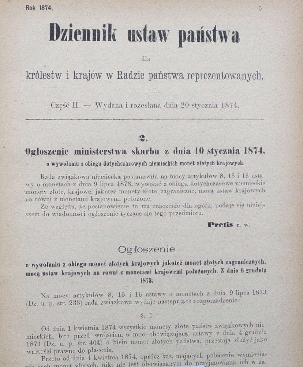 1874 – O wywołaniu z obiegu monet złotych krajowych jakoteż monet złotych zagranicznych
