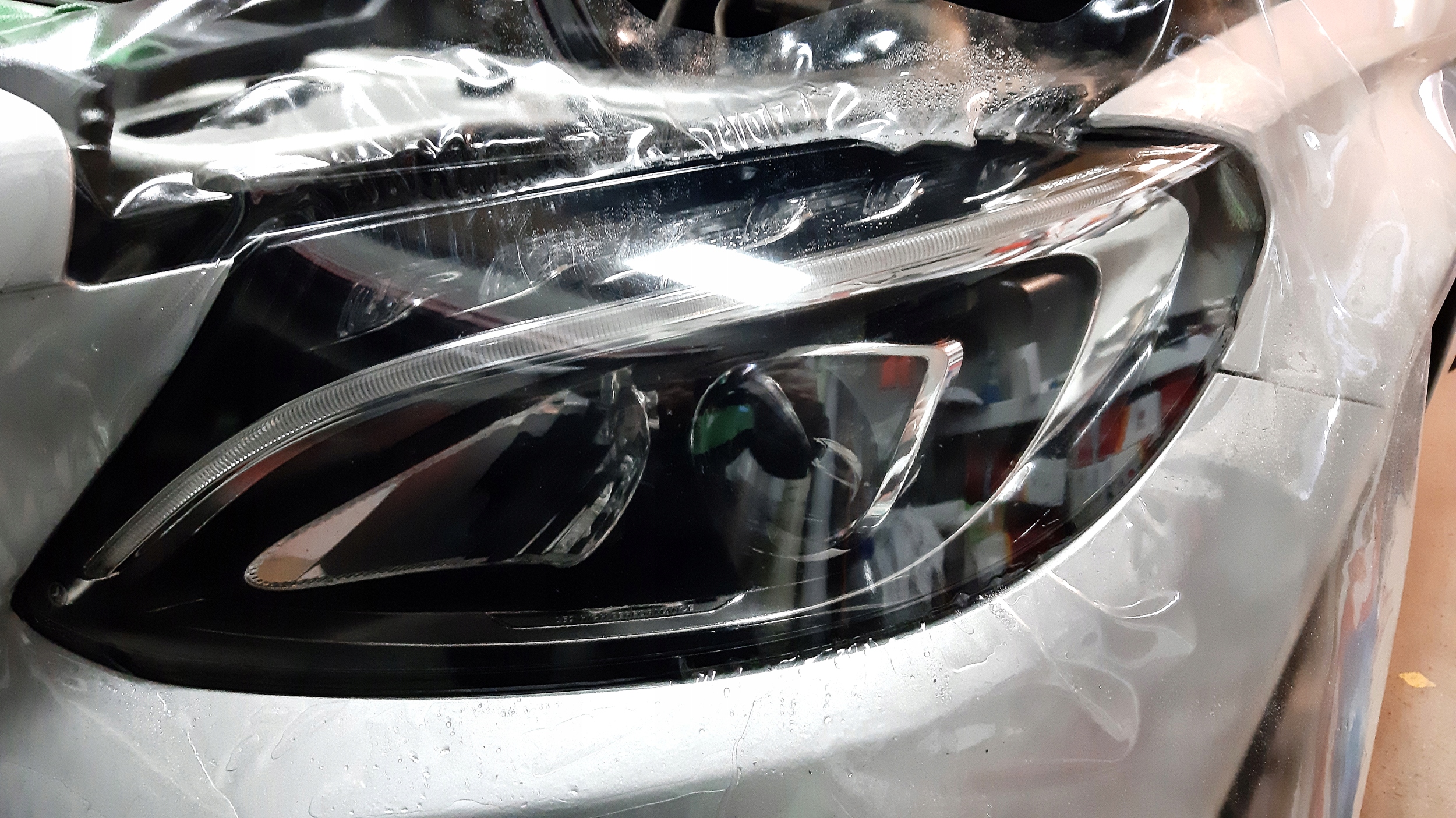 Фольга при нагревании становится более пластичной, и ее можно приклеить на слегка obłych элементах. Ниже пример приложения для передних фар Mercedes-benz C-класса, которые, как видно, на 2 фото они сильно закругленные и оставляют большие излишки пленки, как в верхней, так и нижней части лампы.