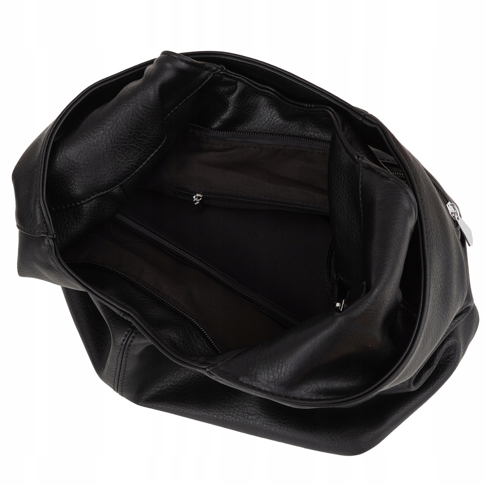 Torebka worek wykonana z wysokogatunkowej miękkiej skóry ekologicznej. Zamykana z góry na suwak. Torebka dwukomorowa przedzielona na środku dużą kieszenią na suwak + wewnątrz jedna kieszonka na zamek oraz jedna na telefon.