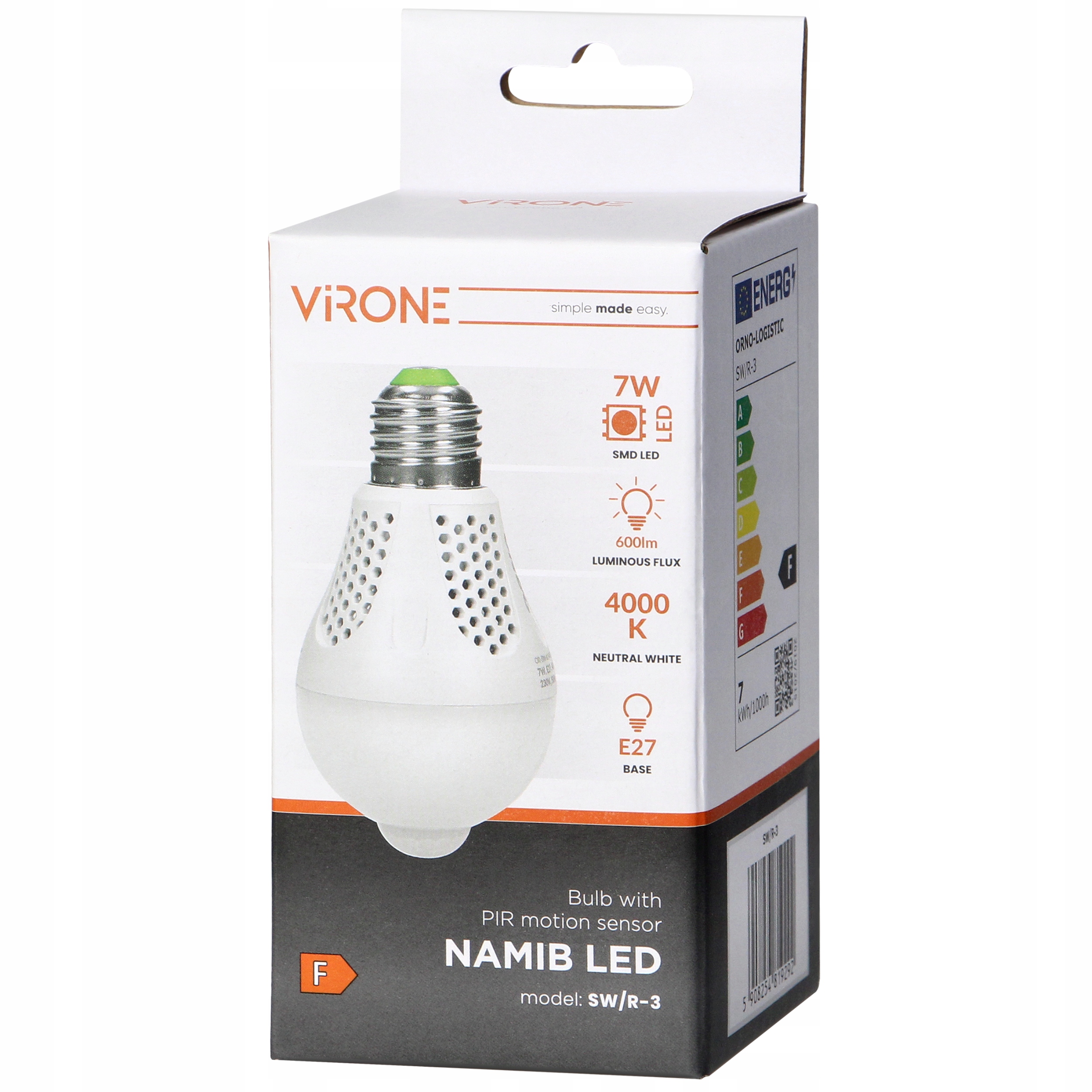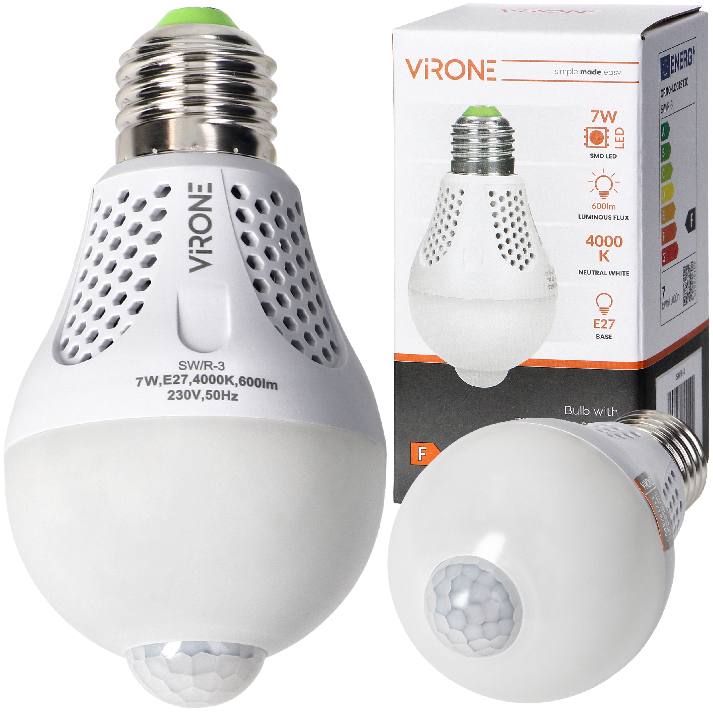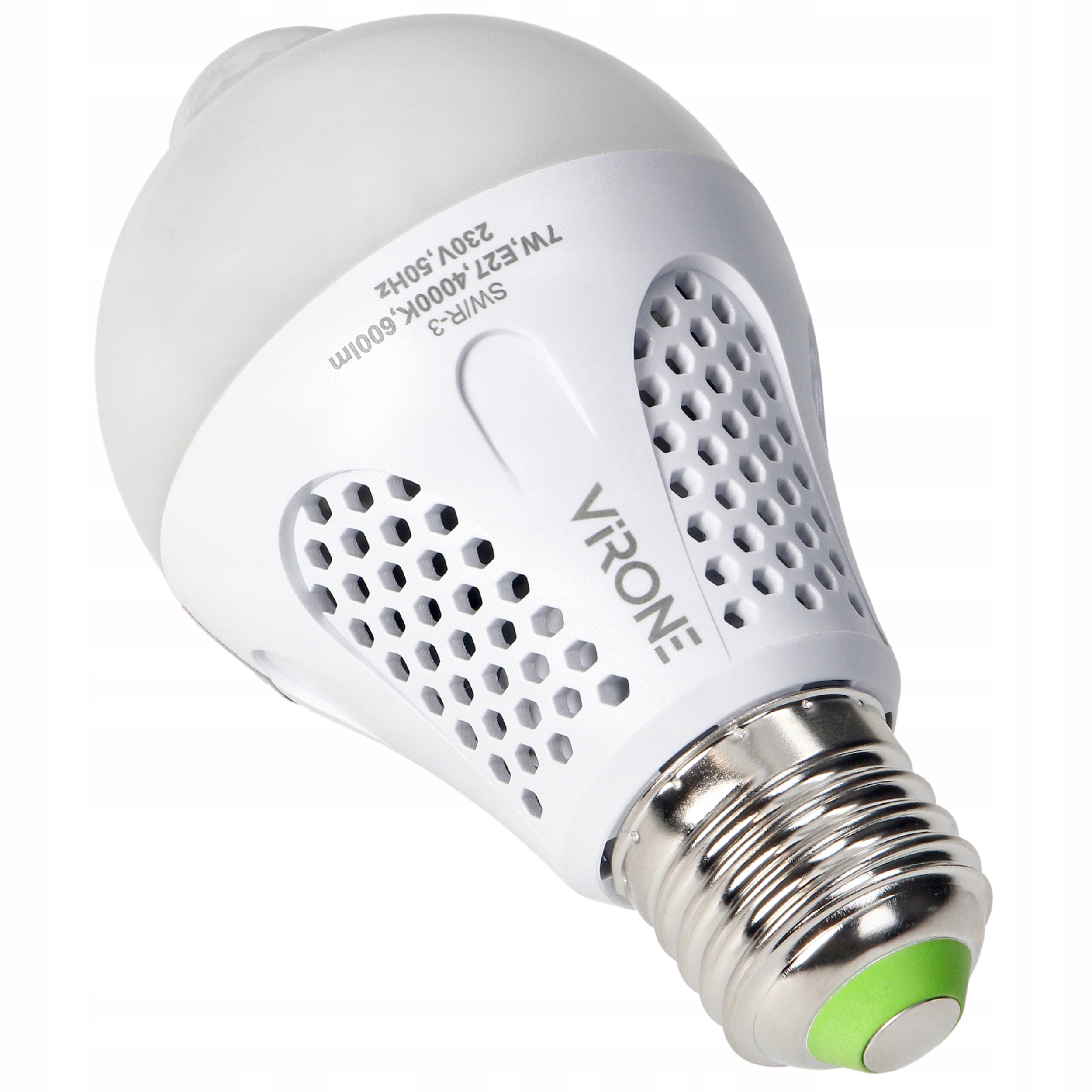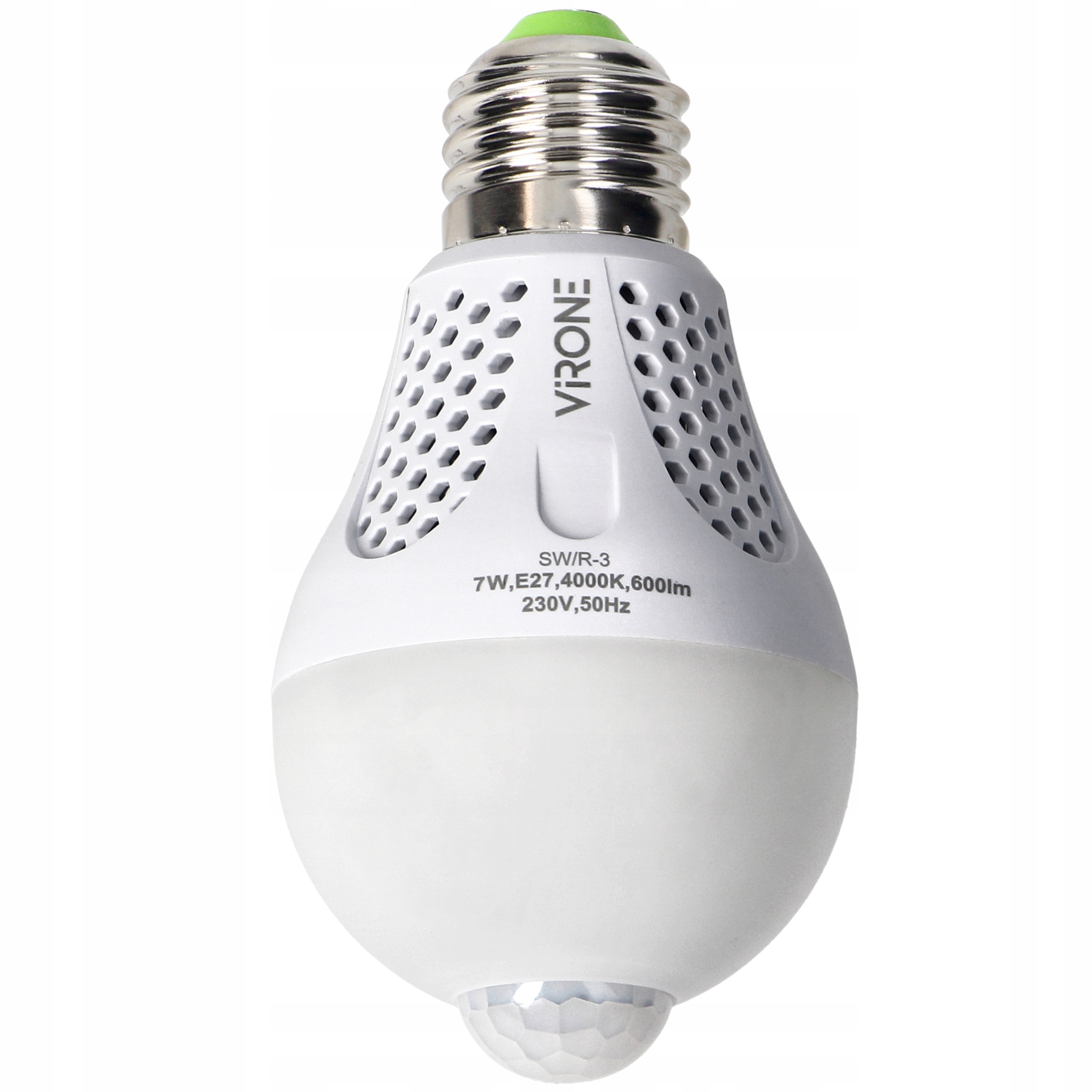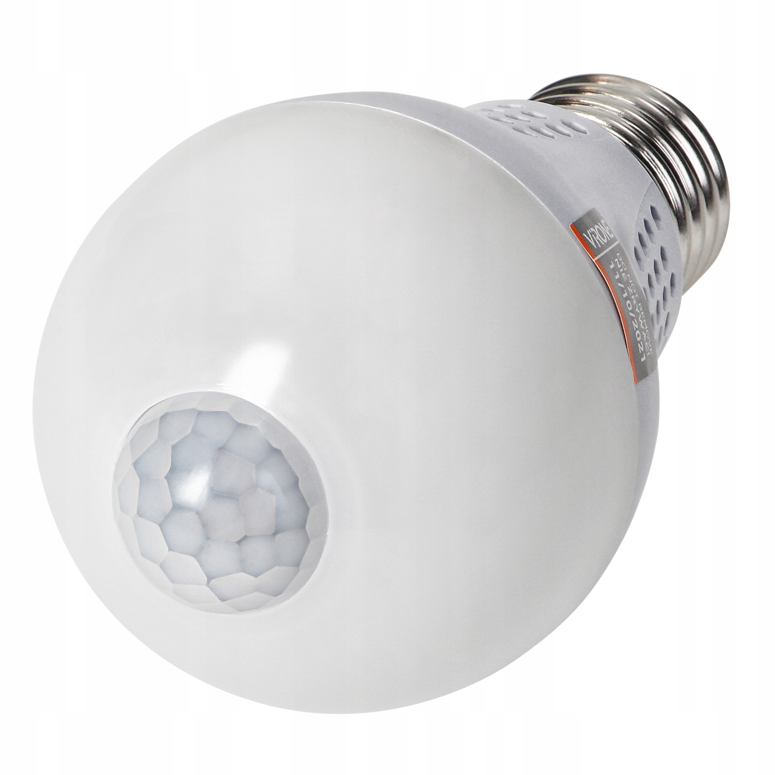 Energooszczędna zarówka LED E27 z czujnikiem ruchu. Gdy oświetlenie otoczenia jest mniejsze niż 20LUX, żarówka załącza się po wykryciu ruchu i gaśnie po opuszczeniu przez obiekt pola detekcji. Idealnie nadaje się do użytku wewnątrz pomieszczeń, takich jak: korytarze, klatki schodowe, pomieszczenia socjalne itp.