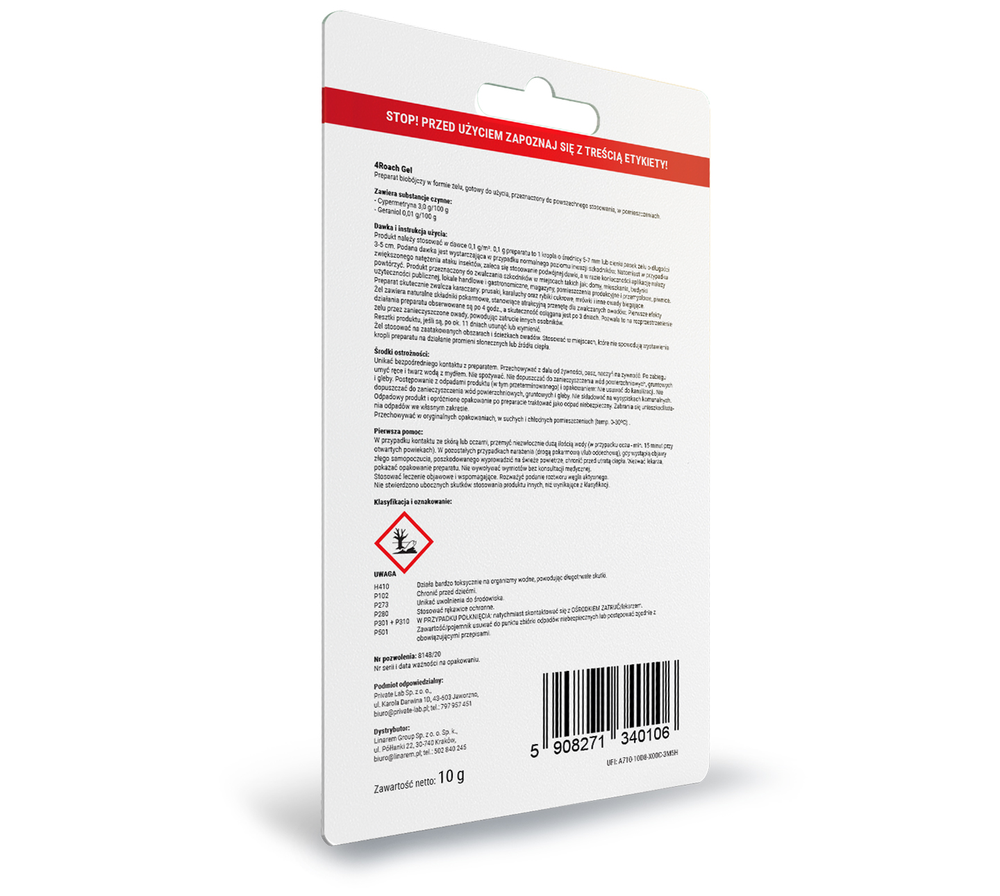 4Roach Gel to preparat biobójczy w formie gotowego do użycia żelu przeznaczony do zwalczania rybików cukrowych w pomieszczeniach (łazience, kuchni i innych). Środek na srebrzyki do powszechnego stosowania.