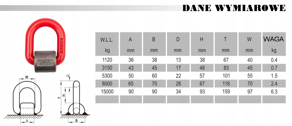 WYKONANIE: Uchwyt do przyspawania typu D-ring po przyspawaniu pozwala na swobodnie obracanie się o kąt 180 stopni wokół osi podstawy przy zachowaniu równomiernego obciążenia. Połączenie uchwytu do elementu bazowego metodą spawalniczą. Uchwyt wyposażony w sprężynę, która pozwala utrzymać ucho w dowolnej pozycji, jednocześnie sprężyna umieszczona między uchem a elementem mocującym ogranicza hałas wywołany drganiami. Uchwyt malowany proszkowo w kolorze żółtym lub czerwonym /kolor uzależniony od dostawy/, wykonany ze stali stopowej kutej matrycowo. Występuje w wersjach DOR: 1,12t; 2,0t; 3,15t; 5,3t; 8,0t; 15,0t.