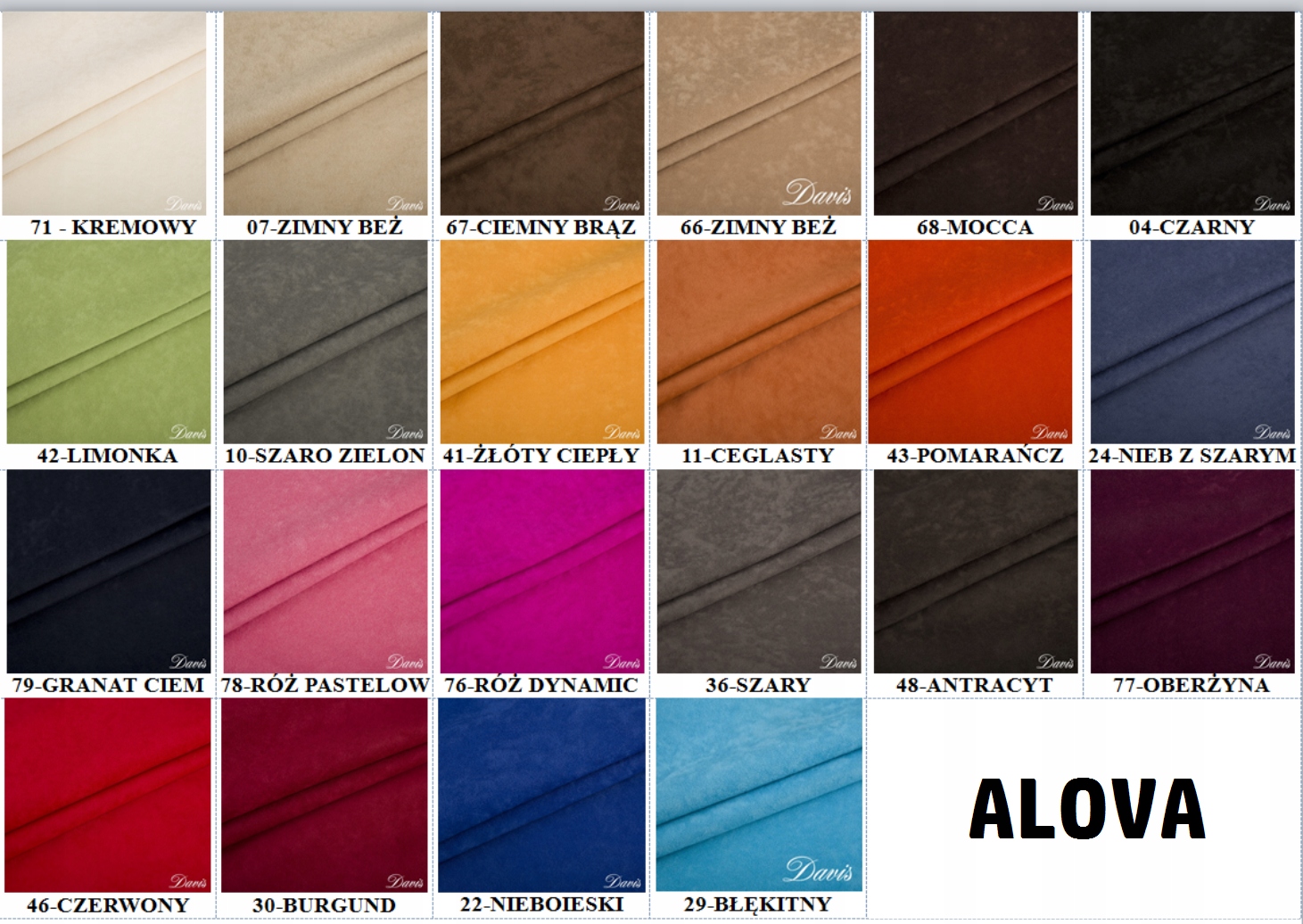 1-ecru , 2-beżowy , 3-piaskowy , 4-jasny brąz , 6-ciepły brąz , 7-gorzka czekolada , 24-ciemny brąz , 5-kamienny khaki , 25-khaki , 17-limonka , 29-lilia , 9-hortensja ,8-fuksja ,28-różowy , 10-jasny niebieski , 19-ciemny niebieski kobalt , 20-czerwony , 32- pomarańczowy , 31-BRAK , 12-popiel , 13 - szary , 14- ciemny szary grafit , 21 - antracyt , 15-czarny.