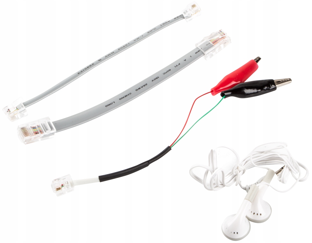 Wraz z testerem (nadajnik i odbiornik) dołączone są akcesoria takie jak kabel telefoniczny RJ-11, ethernetowy RJ-45, kabel z zaciskami szczękowymi (typ krokodyl), słuchawki, bateria.