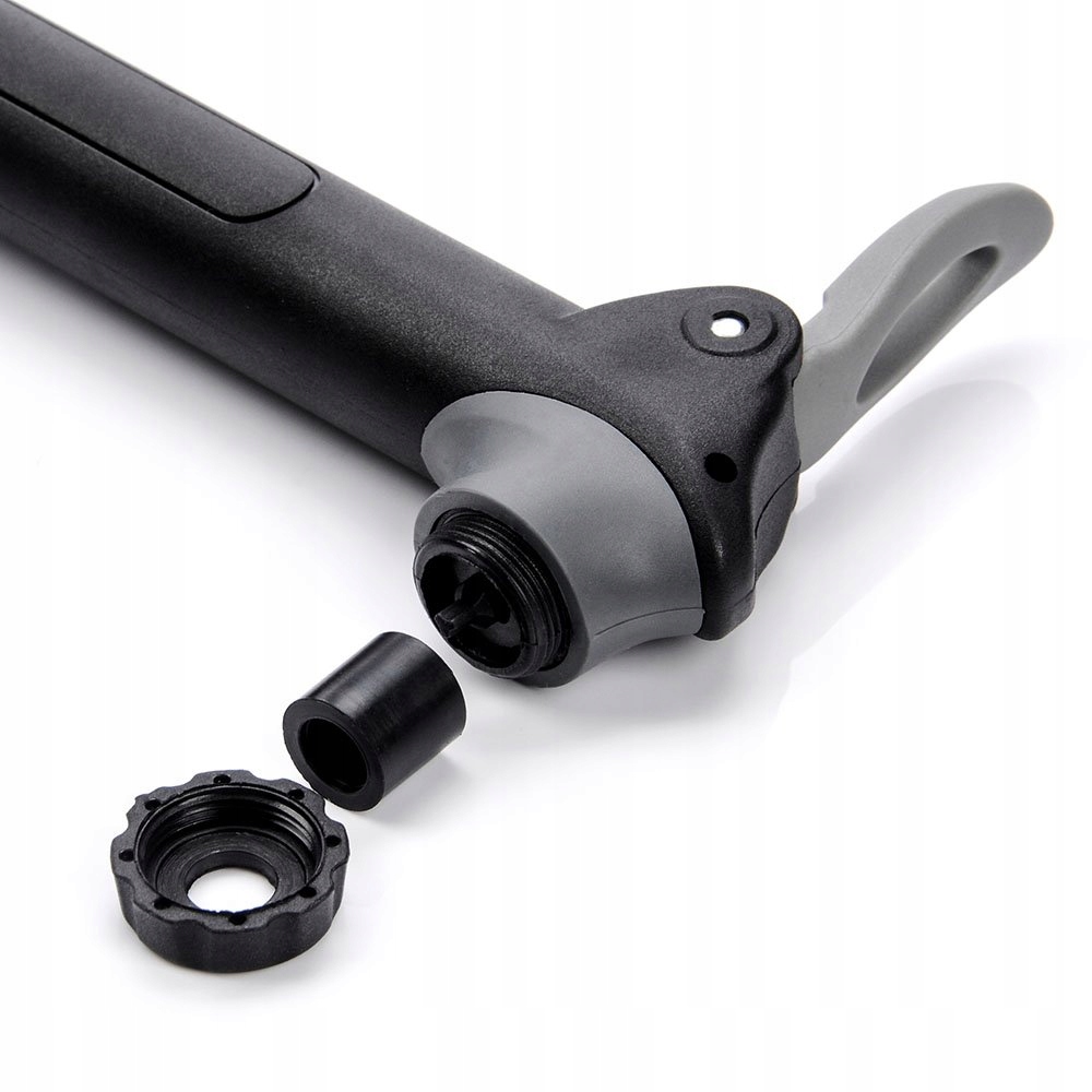 Posiada uniwersalną głowicę kompatybilną z wentylami Presta i Schrader.