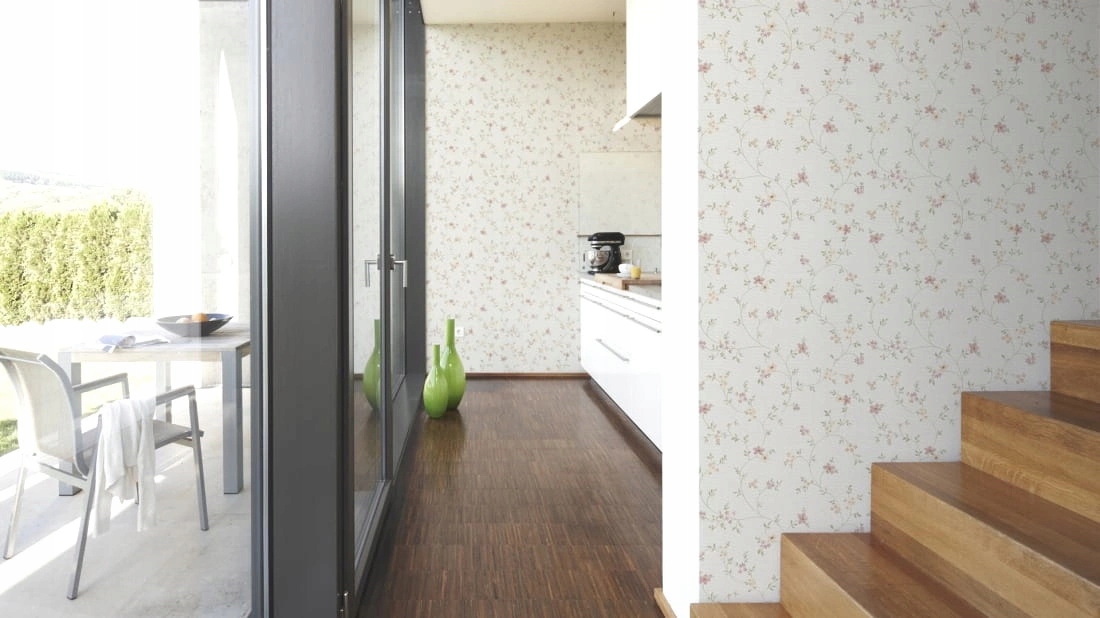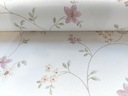 Główne kolory na tapecie: tło w odcieniu ' złamanej bieli ' .Kwiatki w odcieniach zieleni, czerwieni, żółci.