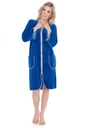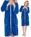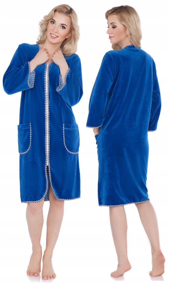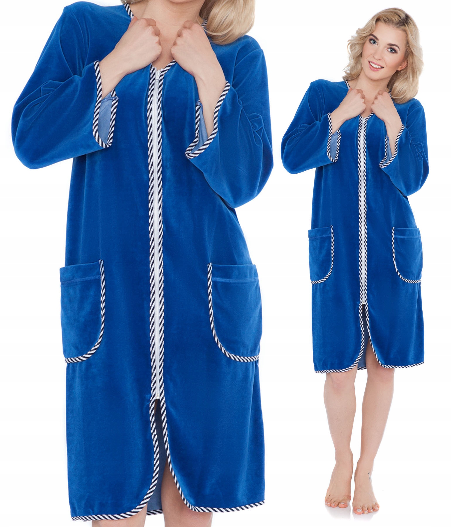 Welurowy szlafrok damski zapinany na ekspres, wykończony lamówką, stworzony z miłego w dotyku materiału. Posiada rękaw długości 3/4 oraz dwie praktyczne kieszenie. Prosty krój zapewni komfort i wygodę użytkowania.