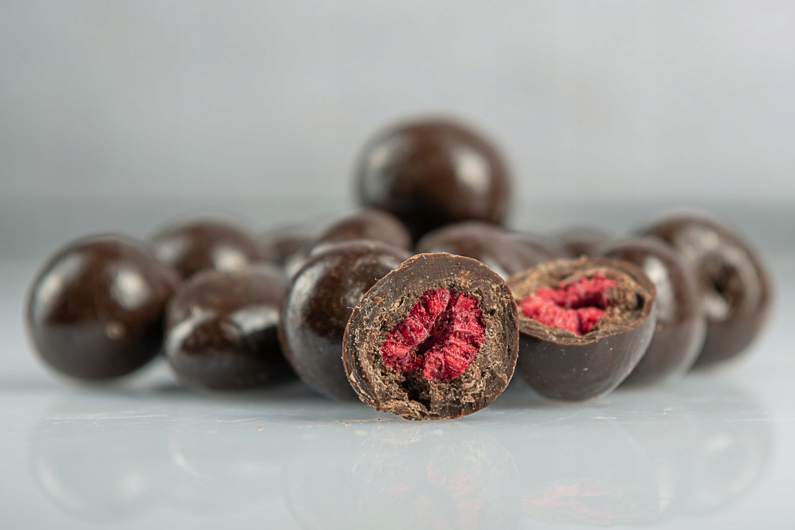 Składniki: czekolada ciemna 90% (cukier, masa kakaowa, masło kakaowe, emulgator: E322 (SOJA), naturalny aromat waniliowy), maliny 8%, syrop glukozowy, polewa/glazura: E414, E904.