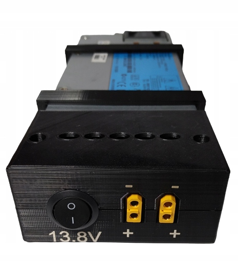 Obudowa umożliwia montaż dwóch gniazd XT60 oraz wyłącznika kołyskowego.Do zestawu dokładam dwa uchwyty do zamocowania zasilacza pod stołem na ścianie itp.