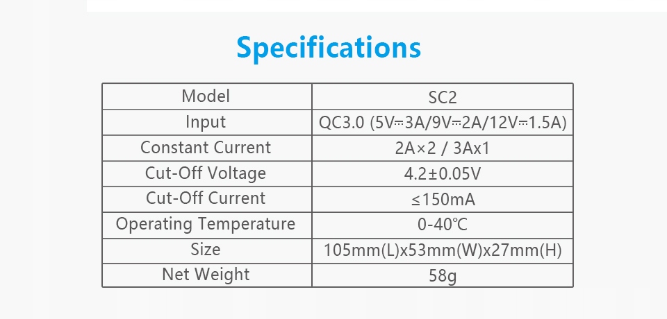 SC2 jest ładowarką do ogniw litowo-jonowych z wejściem zasilania micro-USB. Posiada zdolność ładowania w najszybszym systemie QC3.0. Ładowarka może ładować jeden lub dwa akumulatorki litowo-jonowe o rozmiarach: 18650/ 18700/ 20700/ 21700/ 22650/ 25500/ 26650, w tym zabezpieczone akumulatory 20700/ 21700, przy napięciu znamionowym 3.6V/3.7V. Dzięki algorytmowi ładowania, ładowarka jest inteligentnym i bezpiecznym urządzeniem.
