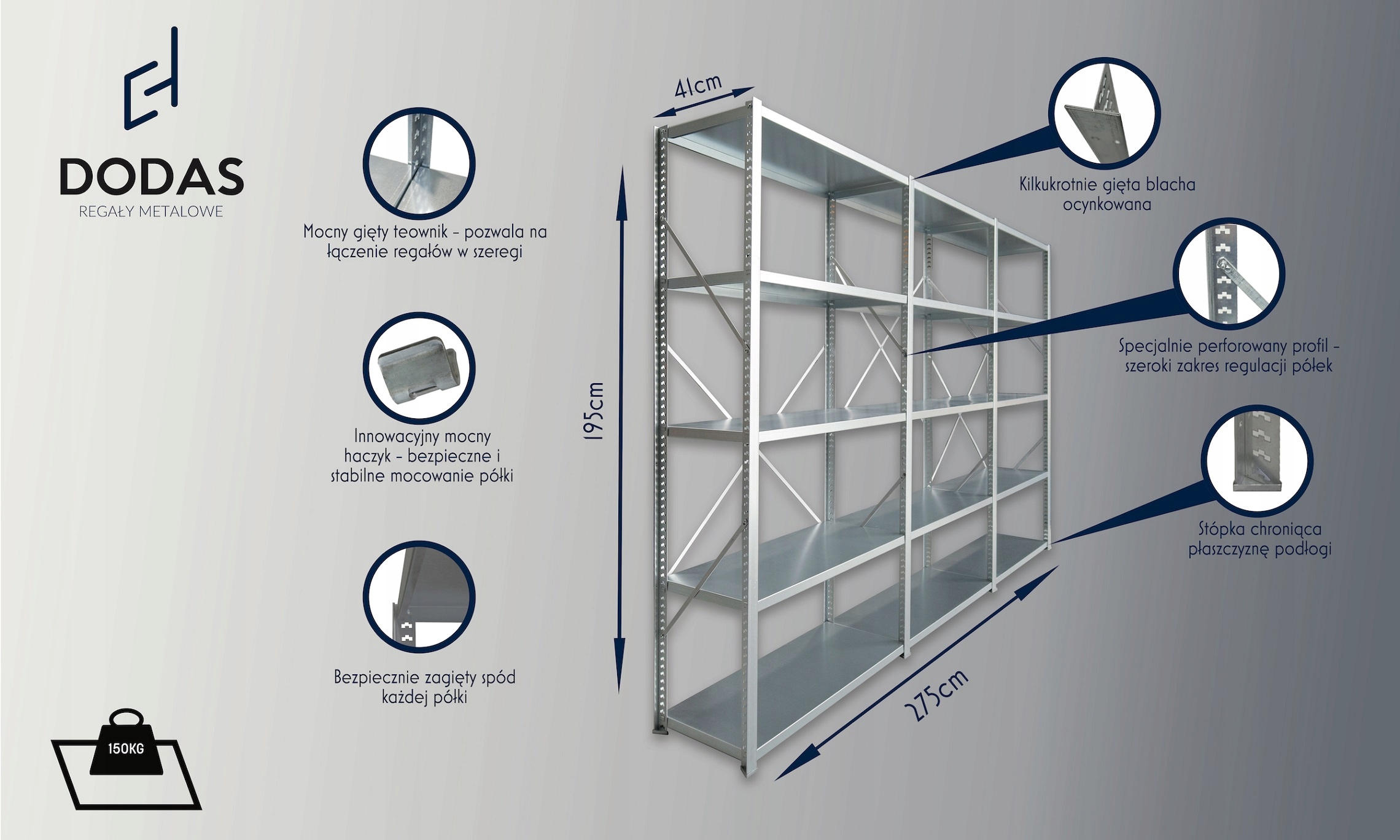 Stabilna skręcana konstrukcja pozwala na obciążenie pojedynczego wolnostojącego segmentu do 1000 kg, natomiast maksymalna nośność półki to 150 kg. Wykorzystanie do montażu innowacyjnych haczyków oraz specjalnie perforowane profile do mocowania to nie tylko łatwość i szybkość montażu, ale bardzo duża dowolność przy regulacji rozmieszczenia półek.