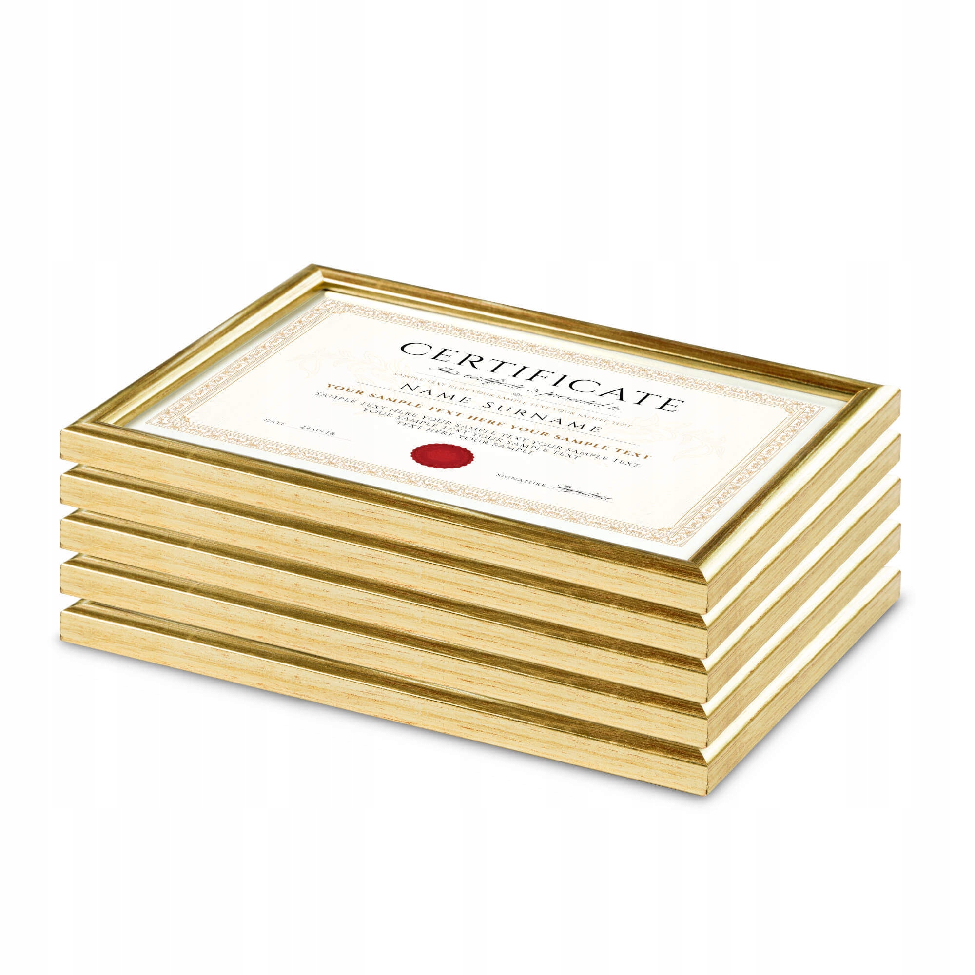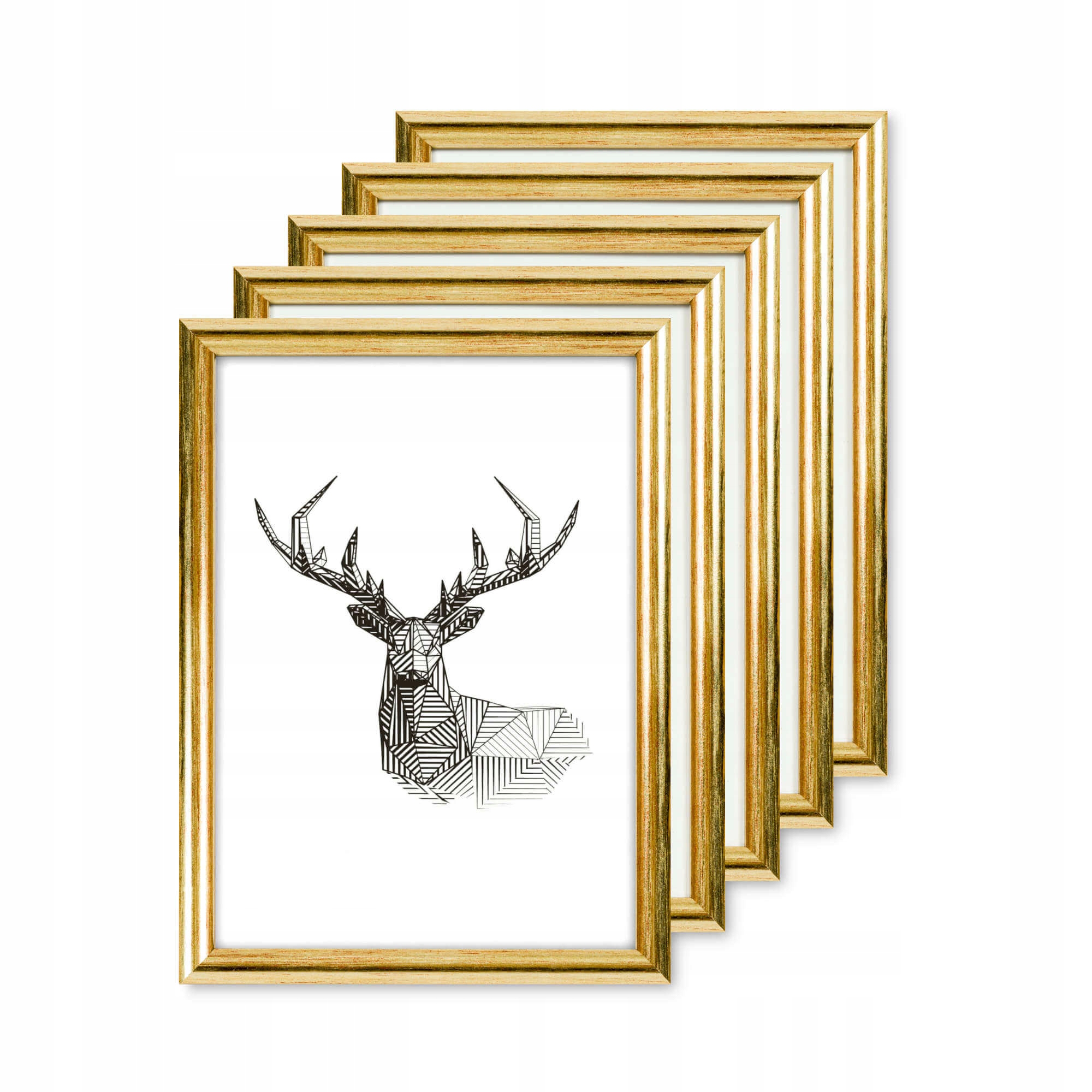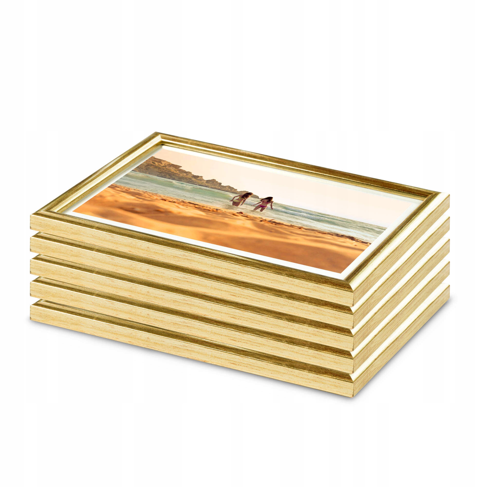 Fotoramki w kolorze złotym o przekroju profilu 12x13 mm wykonane w 100% z drewna. Pakiet ramek drewnianych jest doskonałą propozycją do ekonomicznej oprawy zdjęć, rysunków, druków. Ramki pakowane są w zestawie po 5 szt. Wyposażone są w szkło mineralne. Plecki wykonane są z twardej płyty HDF. Ramki na zdjęcia do rozmiaru 18x24 cm dodatkowo posiadają stopkę / nóżkę która pozwala eksponować oprawiony obraz na biurku lub regale. Pakiet ramek drewnianych DIPLO dostępny jest w rozmiarach od 10x15 cm do 30x40 cm.