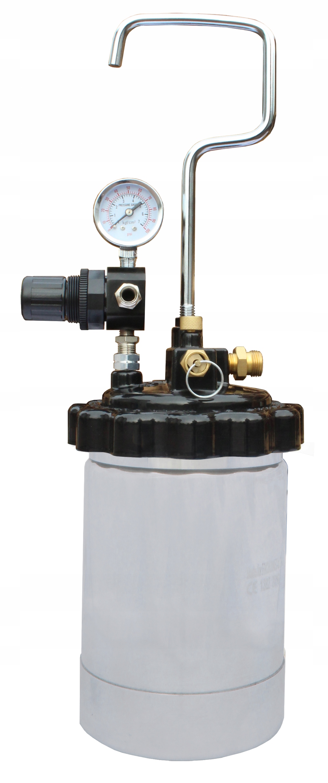Zbiornik ciśnieniowy ma przykręcaną pokrywę jest wyposażony w dwudrożny reduktor powietrza do regulacji ciśnienia wewnątrz zbiornika, zawór bezpieczeństwa, zawór odprężający, uchwyt oraz ssak ze złączką 3/8" do podłączenia węża podającego materiał do pistoletu.
