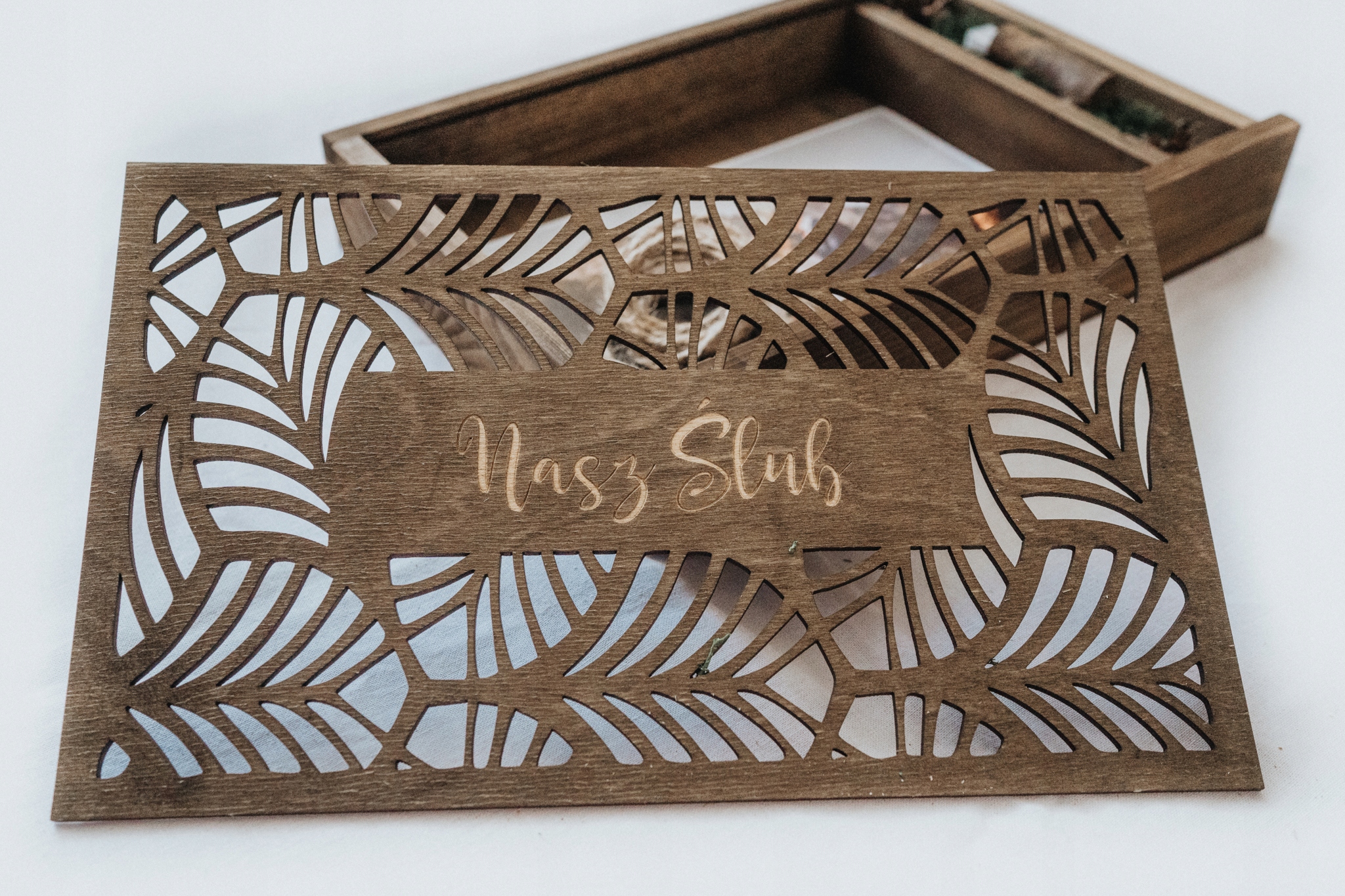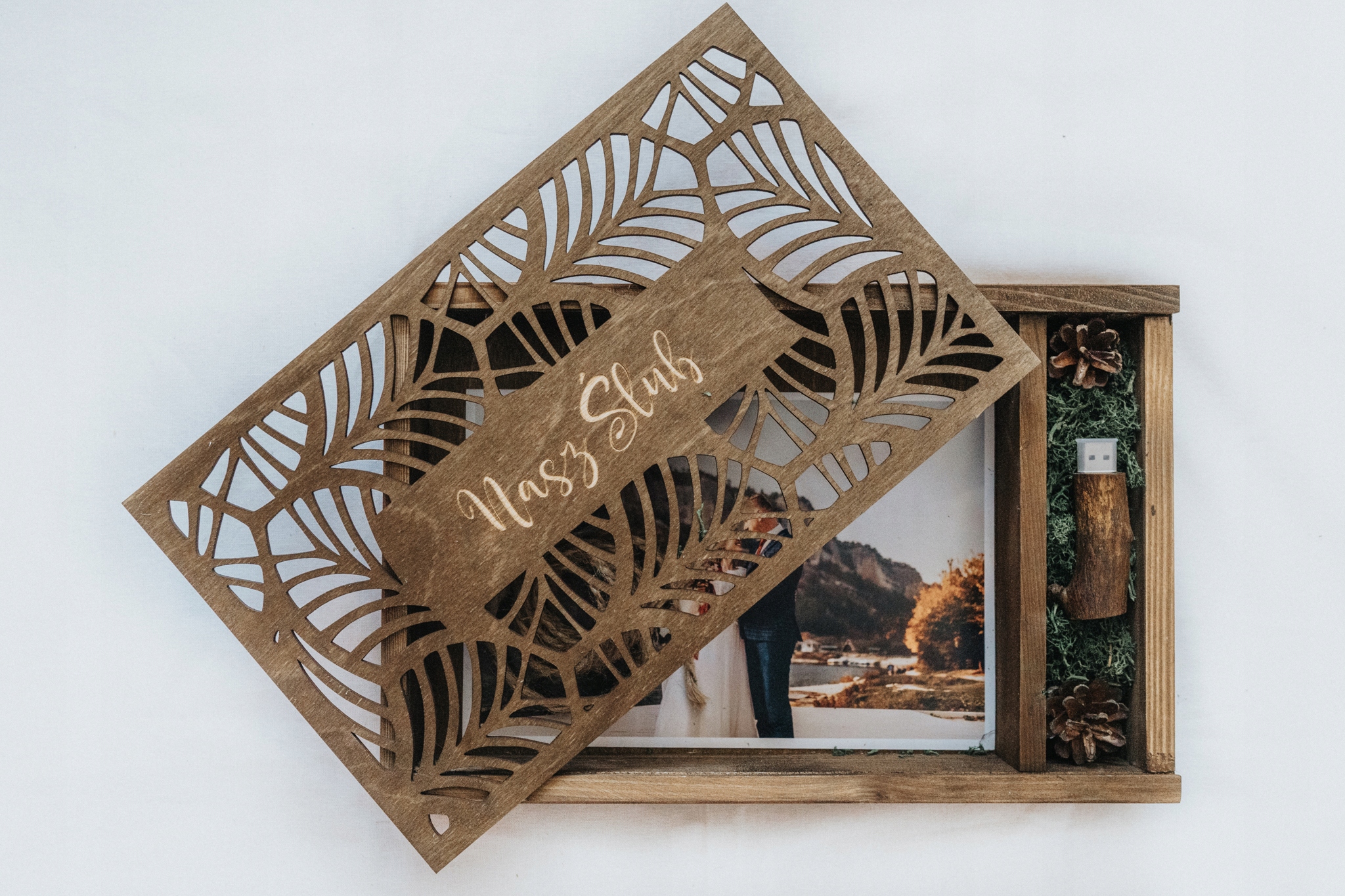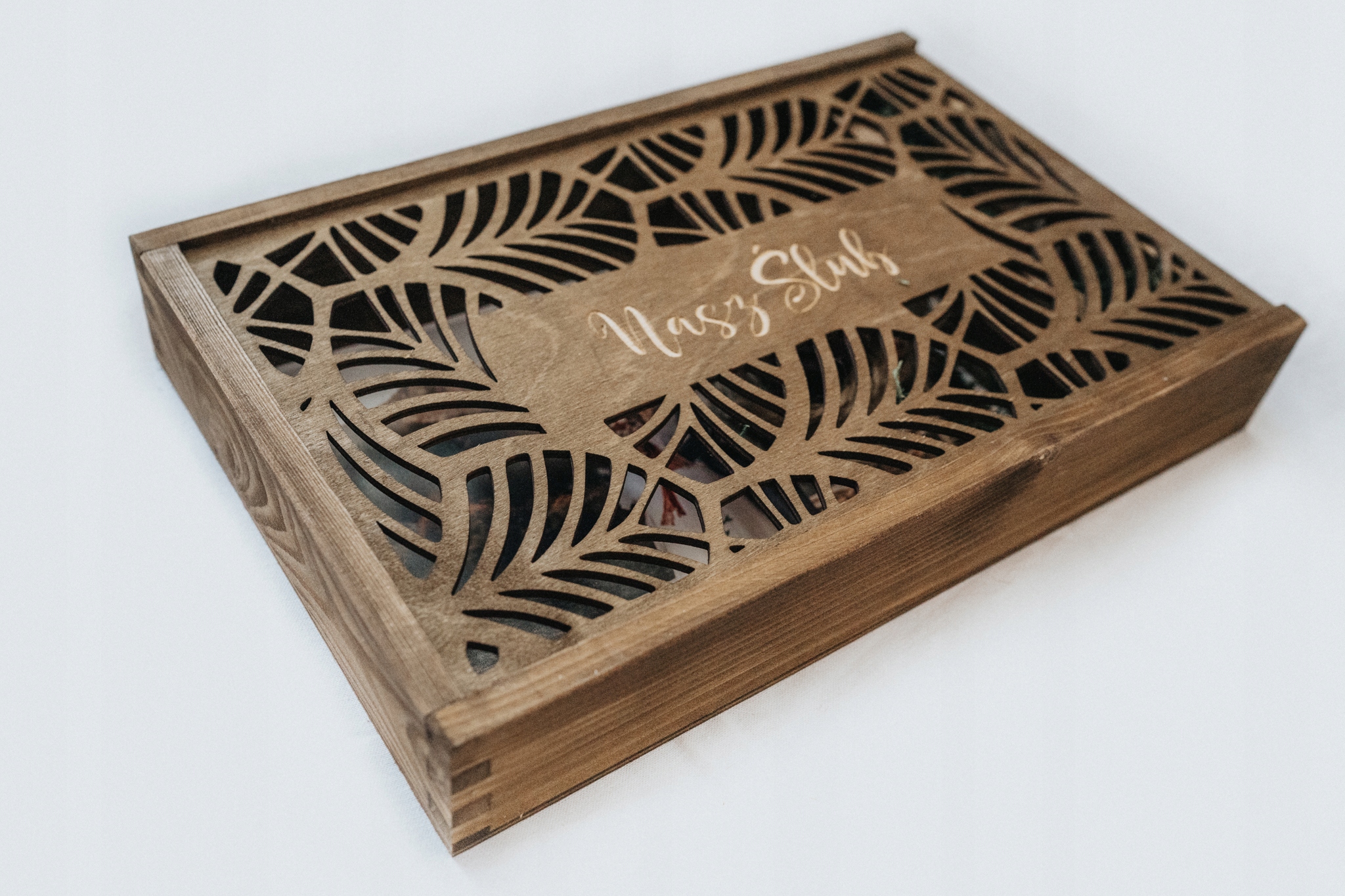 Przedstawiamy Państwu ażurowe, drewniane pudełko na zdjęcia. Pudełko przygotowane jest tak aby pomieścić odbitki w formacie 15x23 cm. Dodatkowym atutem jest przegroda na pendrive. Na pudełku możemy wygrawerować dedykację, logo lub grafikę co będzie stanowić niezapomnianą pamiątkę na długie lata. Mogą Państwo jeszcze bardziej zindywidualizować swoją skrzynkę dodając do niej własne życzenia lub dedykacje.