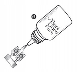 Odkręć zakrętkę pojemniczka Progent i wylej jego zawartość. Przepłucz soczewki pozostawione w uchwycie dla soczewek płynem do regularnego płukania (MeniCare Pure).