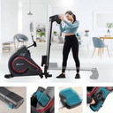 Wioślarz magnetyczny z matą amortyzującą w zestawie to doskonały sprzęt do wszechstronnego treningu wytrzymałościowego. Pomoże Ci wzmocnić mięśnie pleców, barków oraz nóg. Magnetyczny system oporu o wadze 16 kg zapewnia płynną pracę maszyny. Wielofunkcyjny komputerek treningowy z podstawką na urządzenie mobilne umożliwia urozmaicone ćwiczenia na różnych poziomach zaawansowania. Komfort użytkowania podnosi ergonomiczne siodełko oraz regulowane antypoślizgowe platformy na stopy z paskami zabezpieczającymi. Wioślarz wyposażony jest w system szybkiego składania oraz rolki transportowe, zapewniające pełną mobilność sprzętu. Maksymalna waga użytkownika wynosi 150 kg.