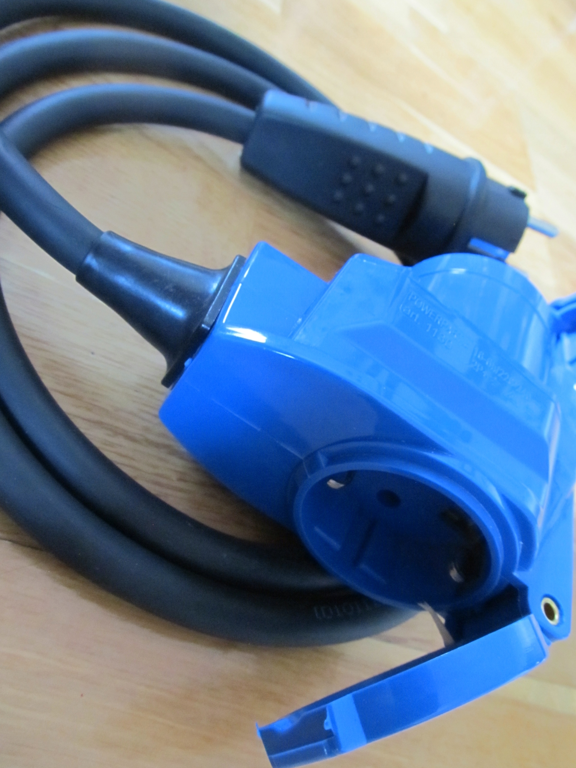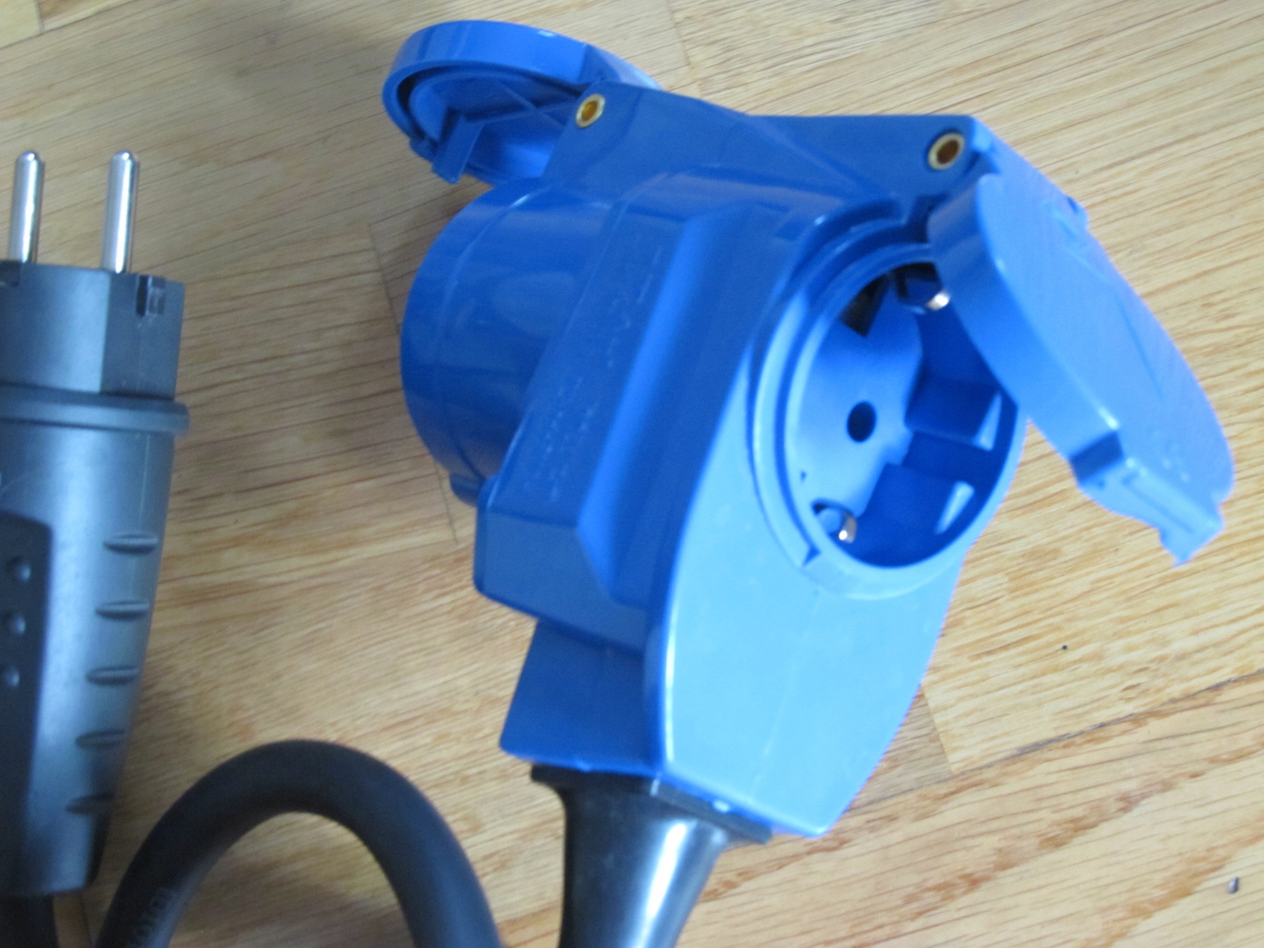 Oferuje do sprzedaży nowy adapter gniazdo kątowe CEE z dodatkową wtyczką na 230V, wtyczka gumowa 230 V (16A) do przyczep kempingowych, kampera, łodzi, itp.