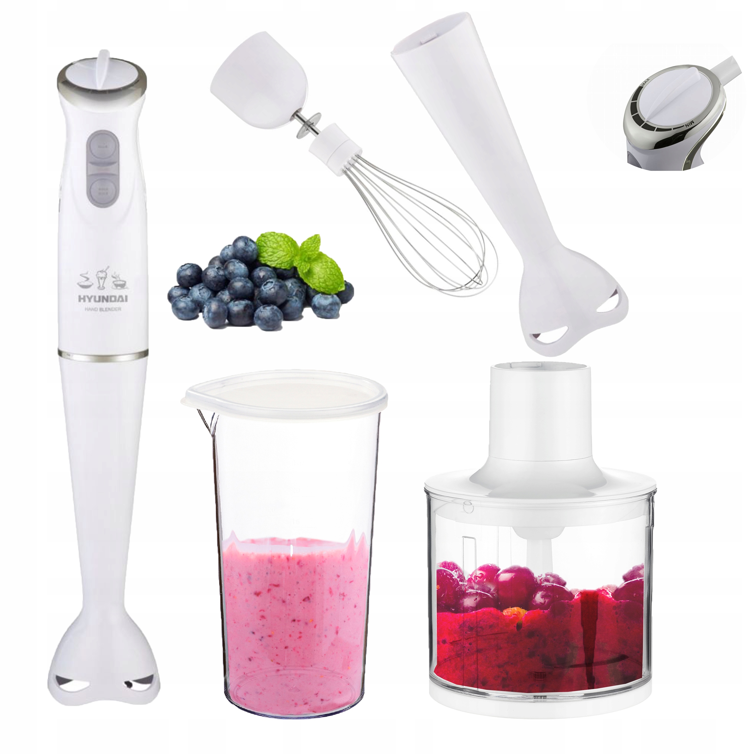 Ручной блендер Hyundai HB 983-это практичное устройство 3в1 с широкими возможностями применение на каждой кухне. Благодаря сменным наконечникам он может выполнять функции блендера, венчик и измельчитель. Это позволяет как взбивать пену, измельчать и пюре. Z он обязательно окажется незаменимым в приготовлении любых супов типа сливок или муссов. Благодаря ему вы также можете легко, быстро и удобно нарезать овощи. есть еще контейнер, в котором можно приготовить вкусный коктейль.