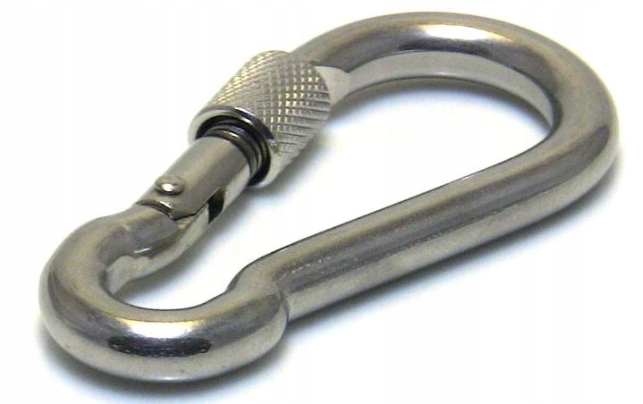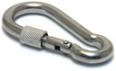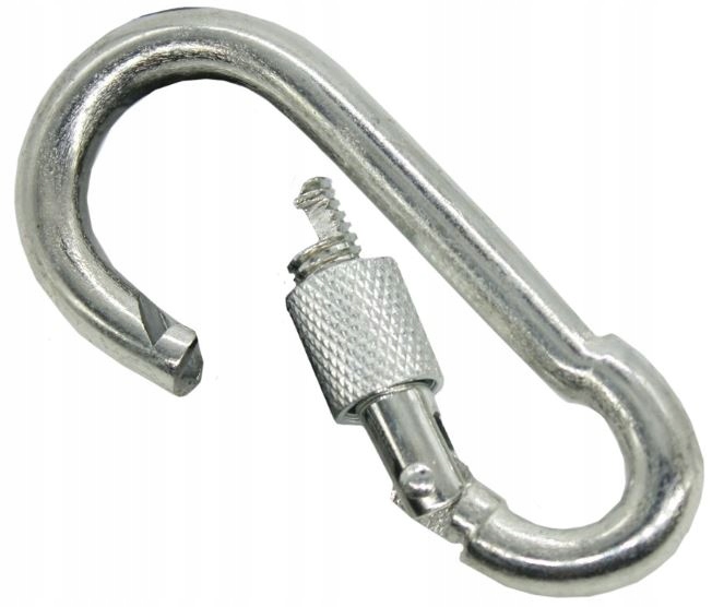 Karabińczyk skręcany z zabezpieczeniem. Karabińczyk z nakrętką stalowy, powłoka ocynkowana, zabezpieczony przed korozją. Stosowany jako zaczep do lin. Karabińczyk posiada nakrętkę, która zapobiega rozpięciu się ogniwa.