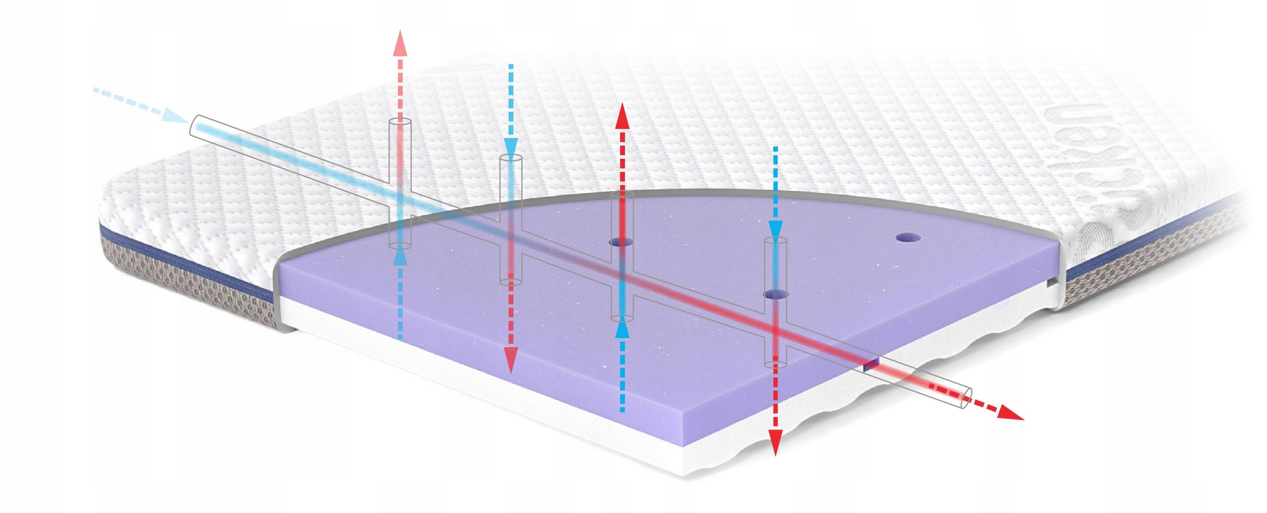 Вентиляционные каналы, расположенные на спальной поверхности, интегрированы с вертикальными канальцами, проходящими через толщину матраса, и канальцами вырезанные внутри картриджа. Эта связь имеет решающее значение, потому что только тогда мы можем быть уверены лучшая циркуляция, в том числе внутри матраса.