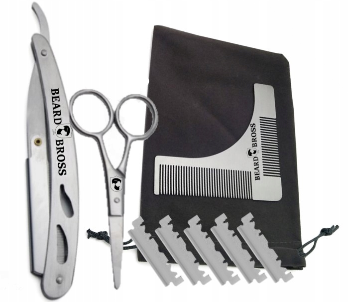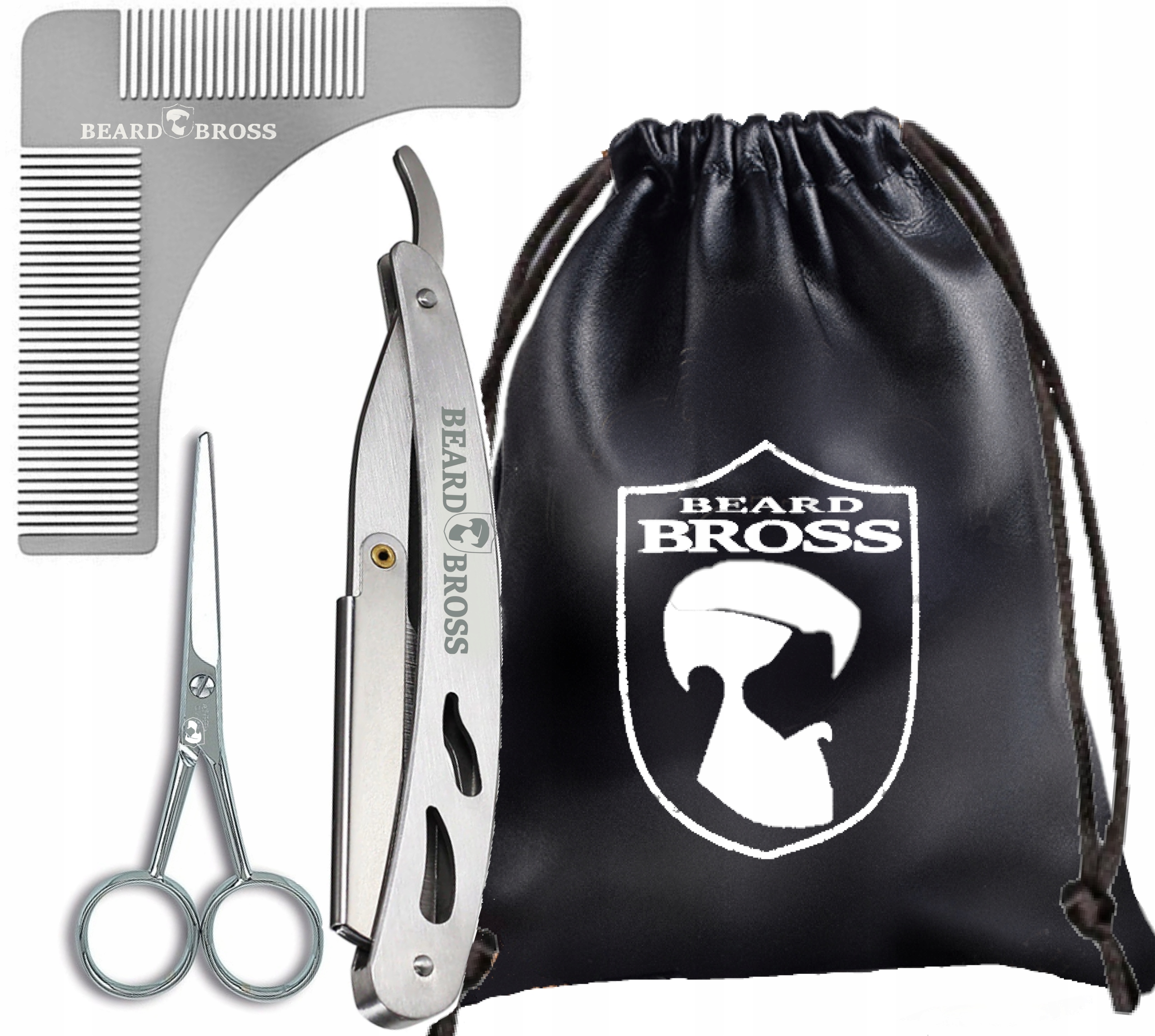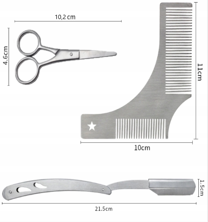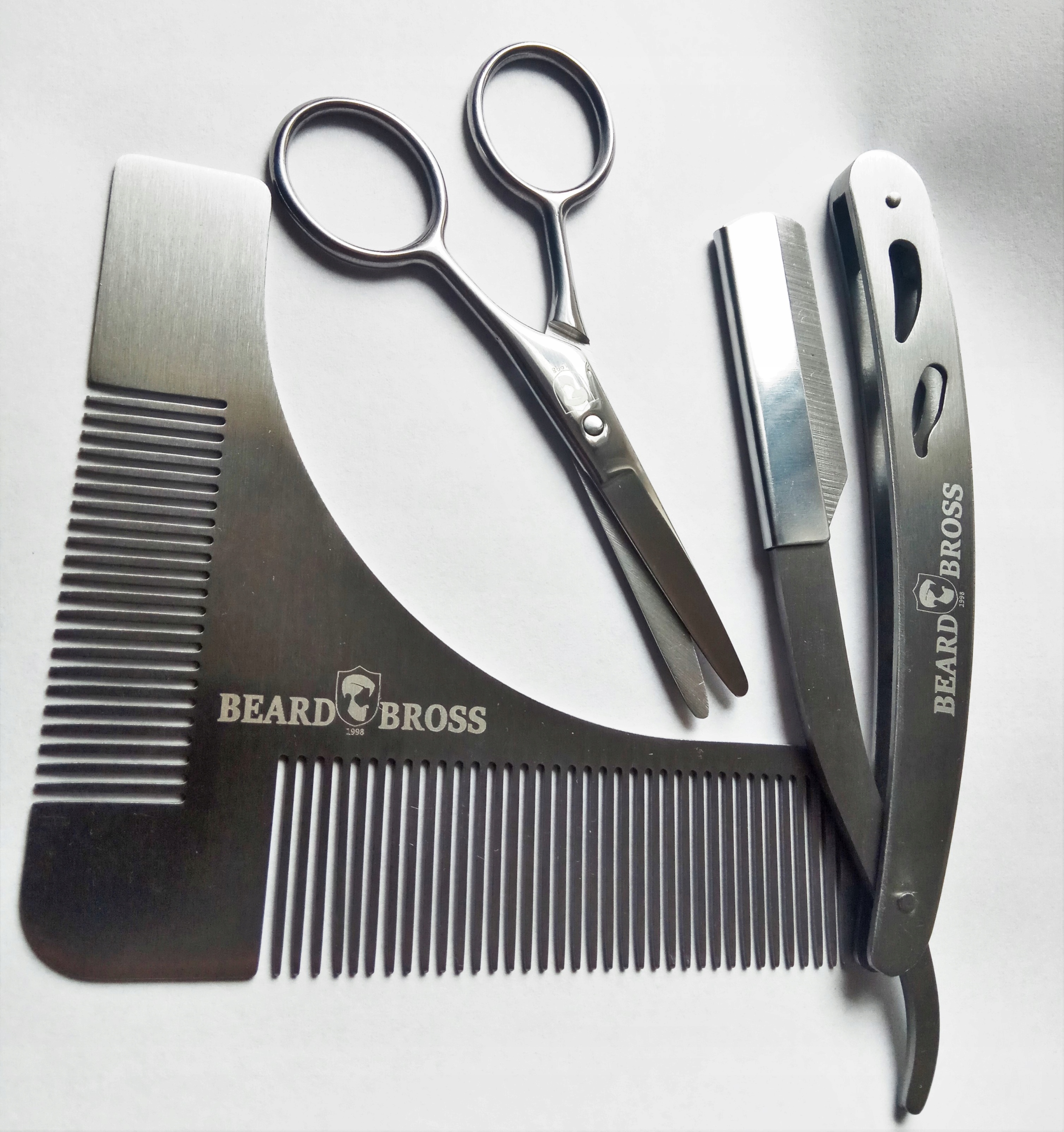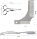 Wzornik wykonany ze stali szczotkowanej pomoże wyregulować idealną linię zarostu. Grzebienie zaś rozczesze każdą splątaną brodę.