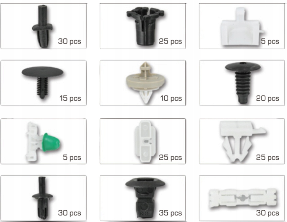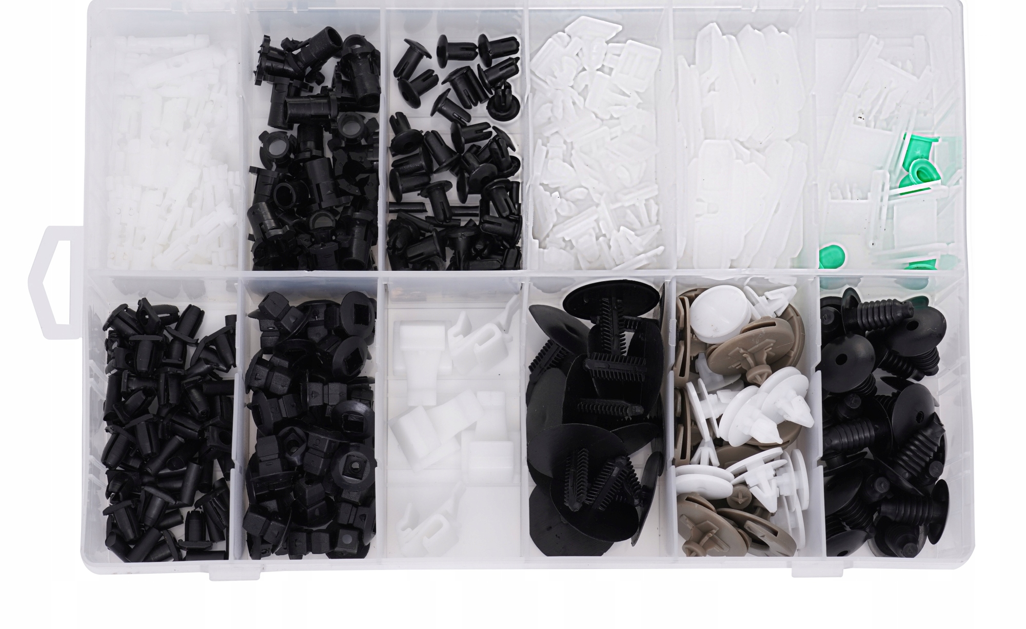 Набор пластиковых зажимов для автомобилей VOLKSWAGEN. Упаковка содержит 12 типов зажимов, всего 255 запонок. Все упаковано в коробку с удобными отделениями.
