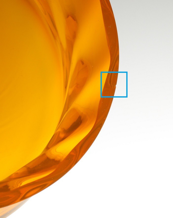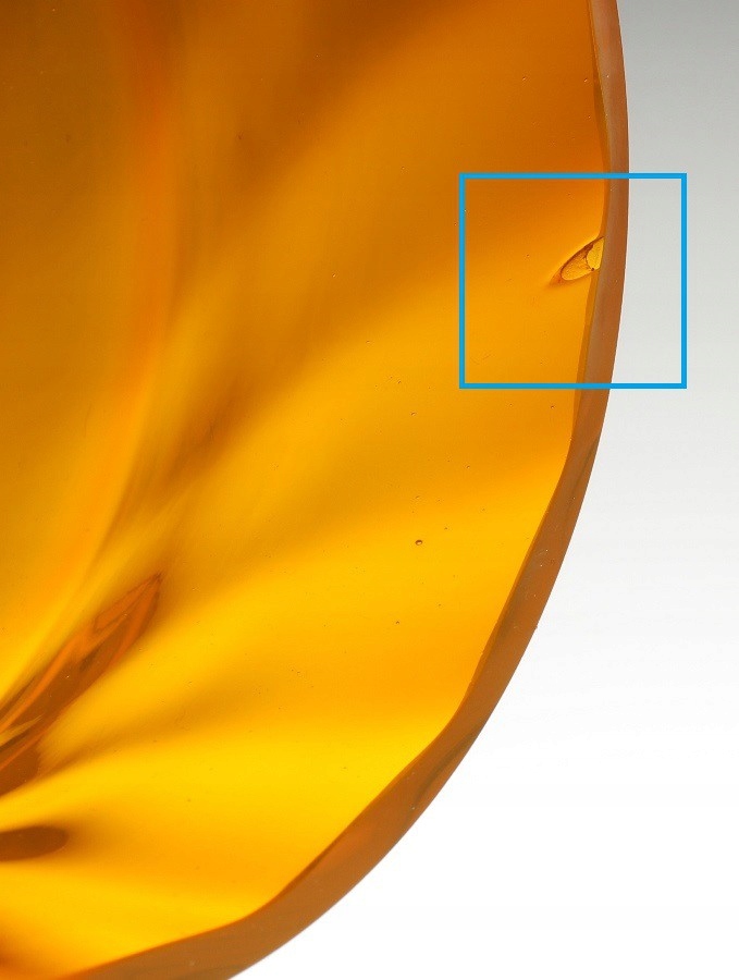 Wnętrze czyste, bez osadu kamienia i rys użytkowych. Na szlifowanej krawędź górnej pęknięty bąbelek powietrza i mikroubytek ok. 2mm.