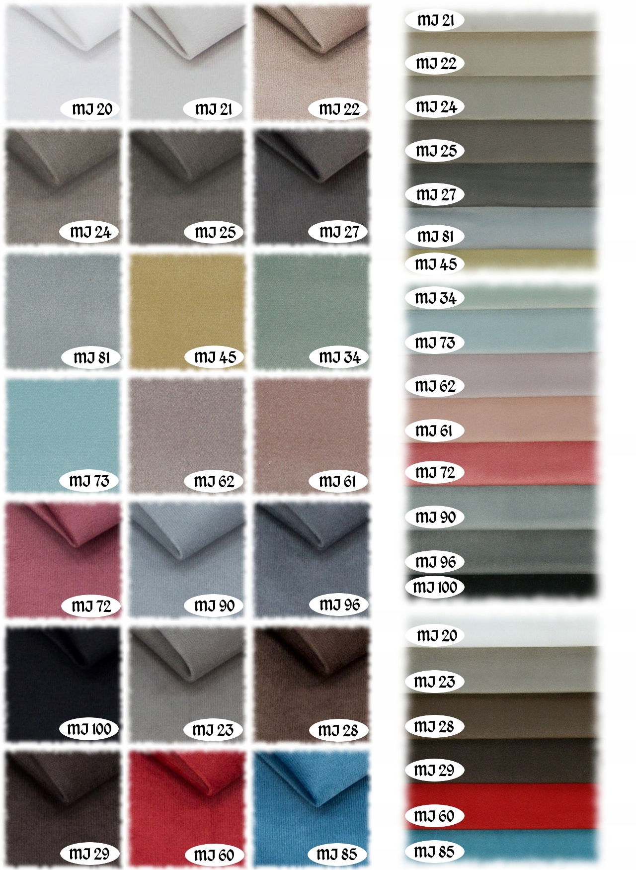 Tkanina MJ20-MJ85 - bardzo przyjemna i miękka w dotyku tkanina pluszowa, jednocześnie bardzo wytrzymała, czesząca się z włosem. Gramatura: 330g/m2, odporność na ścieranie: 100 000 cykli. Zawiera specjalną powłokę, która ułatwia utrzymanie tkaniny w czystości.